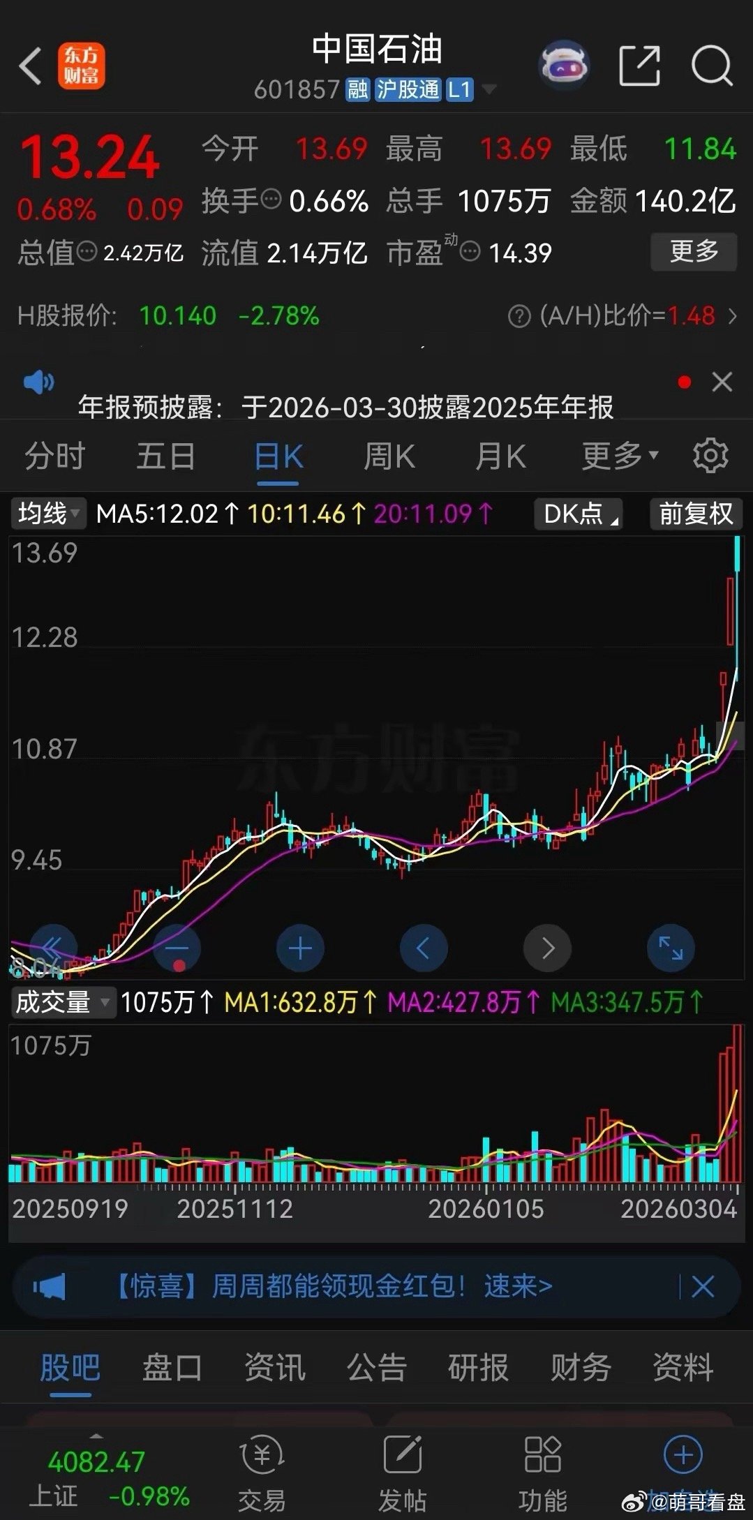 真是服了!两万多亿的盘子居然走出了妖股的走势!今天中石油的走势真是逆天了!早盘高开于13.69元,高开了四个多点后,瞬间闪崩,股价垂直下跌,仅两分钟就打至跌停。但随后抄底资金蜂拥而至,股价再次被拉起,分时图上看一直震荡攀升,下午两点半左右一度大涨超过4%,收盘时股价报收于13.24元,上涨0.68%,虽然涨幅不大,但仍然是红盘报收,今天跌停抄底的股民赚了近11个点,吃了口大肉。看来炒股市值大小并不太重要,只要主力想炒作,大象也能翩翩起舞。但今天多空对决非常激烈,成交额高达140.2亿元,创出历史天量,K线也收出一根倒垂阴线,这会不会是短期见顶的信号呢?