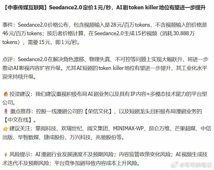 存储、AI算力、AI应用利好信息!1、AI应用方面字节旗下Seedance2.0生成视频价格公布,生成视频一秒1块钱。AI漫剧:德才股份、掌阅科技、兆驰股份、中文在线、荣信文化、万兴科技