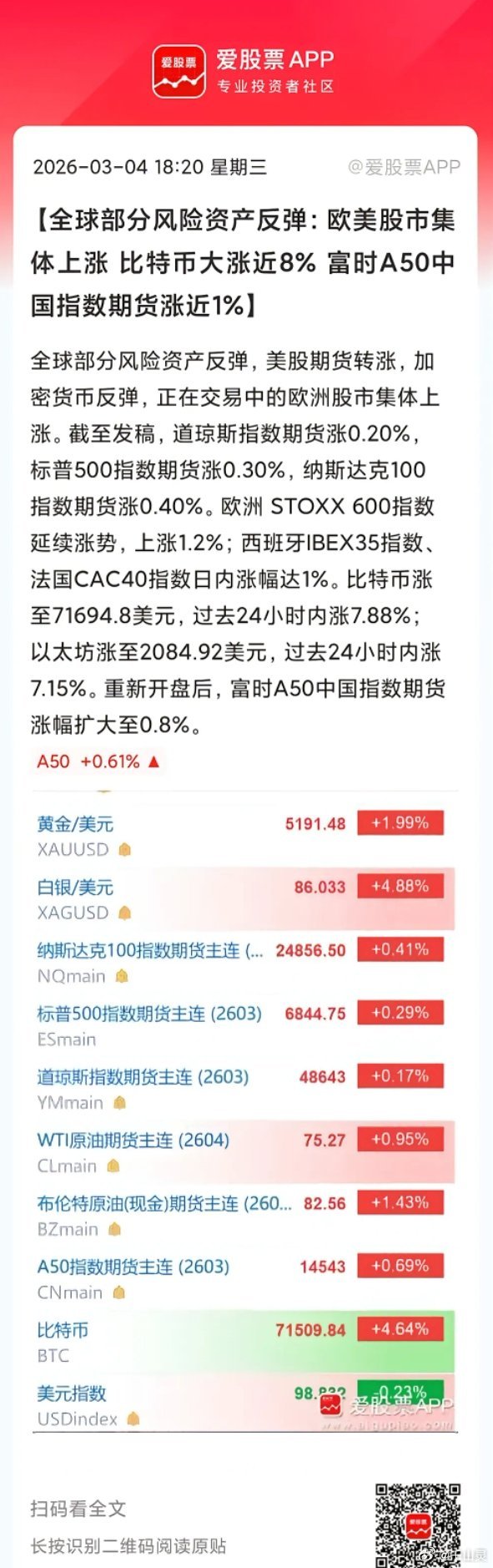 盘后利好齐至!全球大反攻盘后全线飘红:欧洲股市集体拉升,美股盘前走强;黄金白银再度飙升,比特币大涨近8%;富时中国A50指数期货涨近1%,外围暖风不断。这边市场在涨,那边局势依旧紧张:伊朗确定最高领袖候选人,表态不与美国谈判、战争可继续,并称要全力以赴打赢“存亡之战”,嘴硬依旧,但市场似乎已在计价缓和预期。最近行情太难熬,不少朋友利润回吐、心态波动,情绪压到极致。明天A股也该迎来一波反弹,给大家喘口气,急需一根阳线稳住军心。希望明天开门红,让大家回点血、提提气!