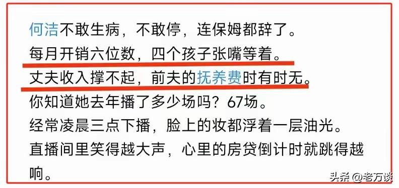 何洁,曾经的超女,当时也是红遍大江南北,想不到再次进入大家的眼帘是她带着四个孩子生活,又跟赫子铭离婚,生活孤苦伶仃,没有依靠,据说她不敢生病不敢停,因为她有四个孩子嗷嗷待哺,连保姆都用不起了,而前夫哥抚养费时有时无,娘仔五人生活艰难,每月开销六位数以上。看到他们每月开销真是惊掉了我的下巴,几十万每月,每人最起码两万每月的消费支出。这到底过得是什么神仙生活,居然会认为他穷,她心中的穷跟大家理解的穷不一样的。这真的是穷人给富人捐款,还在可怜人家过得惨,实际上自己连人家的零头都够不上。实在太讽刺了。