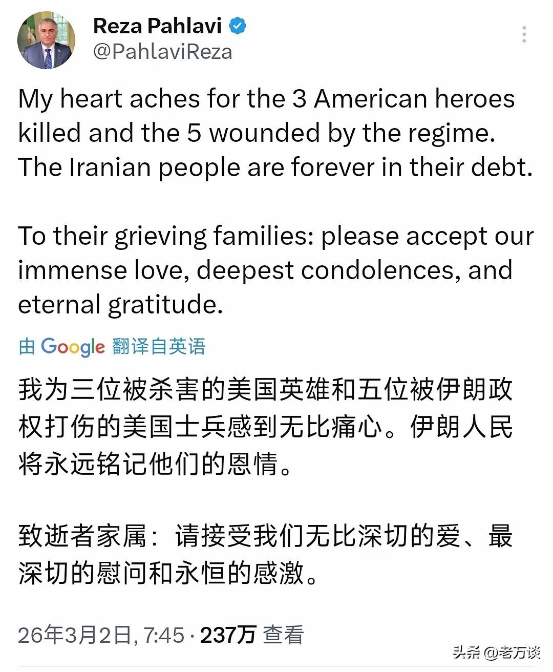 伊朗巴列维王朝的末代王储,也是伊朗末代国王穆罕默德·礼萨·巴列维与法拉赫·巴列维皇后的长子礼萨·巴列维为在美国、以色列袭击伊朗的战争中战亡的三位美国士兵和 5 位受伤的美国士兵表示深切的哀悼,并且表示伊朗人民永远感激美国大兵的恩情。当看到这个消息的时候,让人很惊讶。虽然他是流亡海外的伊朗人,但是面对美国对伊朗的轰炸,特别是美国对伊朗小学的轰炸,造成 100 多人死亡的惨烈事件,他没有发声,但是面对几名美国士兵在伊朗战亡的消息,他却为他们哀悼了。虽然他是被伊朗当局赶下了台,对伊朗当局存在痛恨,他的心情可以理解,但是面对侵略者对自己同胞,特别是对于无辜同胞的滥杀,他无动于衷,但是对于侵略者的死亡,他却饱含深情,真的让人很疑惑,为什么他不同情自己的同胞,而同情侵略者的生命,虽然他被赶下台了,难道那么多条生命唤醒不了他对同胞的同情吗?面对美国的侵略,面对同胞的被杀戮。他怎么能够这样呢!仇恨让他迷失了自我,迷失了是非。