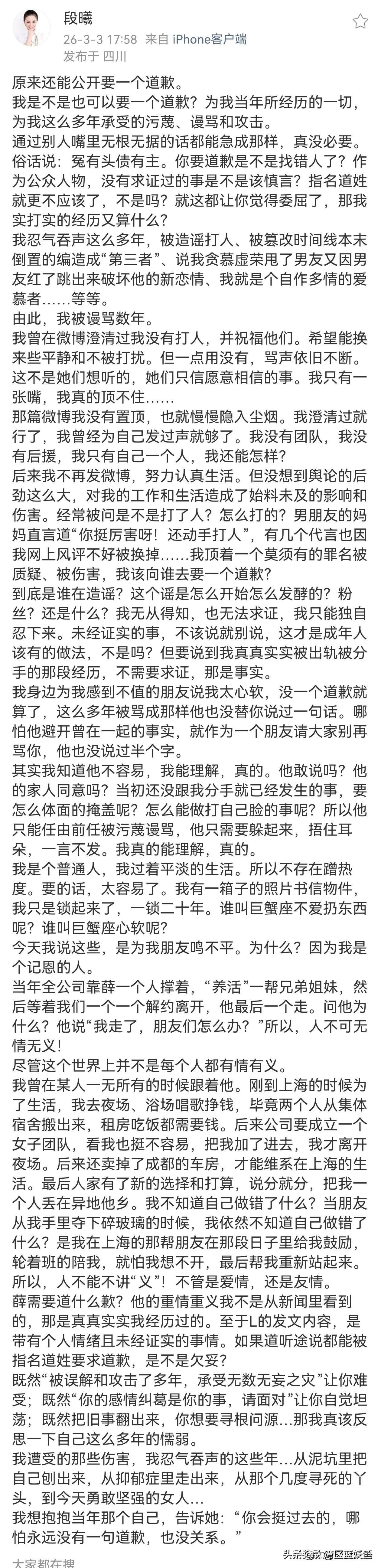 刷到张杰和段曦的旧照,突然觉得有些话想跟还没结婚的姑娘们唠唠——不是说爱情不能共苦,是共苦前得先看看这人值不值得。 段曦当年为张杰卖房、跑场赚钱的事儿,搁现在看依旧戳心。一个姑娘把嫁妆本都投进去,陪着对方住出租屋、吃泡面,图啥?不就图那句“等我火了一定好好对你”。可现实呢?火了的人转身就有了新选择,留下的人不仅成了“过去式”,还得背着莫须有的谣言走十几年。 最寒心的不是被丢下,是被泼脏水时,那个你曾捧在手心的人,连句“不是这样的”都不肯说。薛之谦都能站出来为素不相识的人较真,前男友却装聋作哑,这对比,谁看了不替段曦委屈? 说真的,姑娘们别信“共苦之后必同甘”的童话。吃苦本身不可怕,怕的是你把对方熬成了参天树,自己却成了被根系挤死的草。他低谷时你拉一把是情分,但别把自己的人生全押进去——你的房子、你的存款、你的前途,都是自己的底气,不是给别人垫脚的砖。 谢娜这次替张杰要道歉,本意可能是护着老公,结果反倒把旧事翻出来让更多人瞅见这茬。说白了,感情里最忌讳“拎不清”:既别做那个用完就丢的人,也别当那个掏心掏肺最后连句公道话都换不来的人。 记住啊,好的感情是两个人一起搭梯子往上爬,而不是你蹲在底下托着他,等他爬上去了,还嫌你挡路。共苦可以,但得留三分清醒给自己——他值不值得,看他怎么对“过去”,就知道将来会怎么对你。