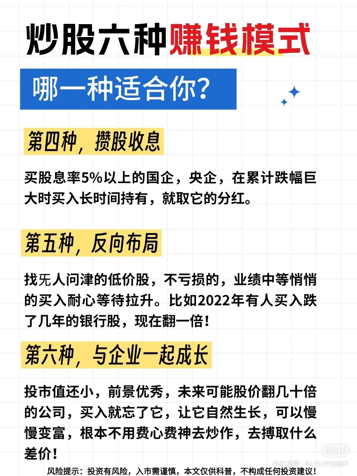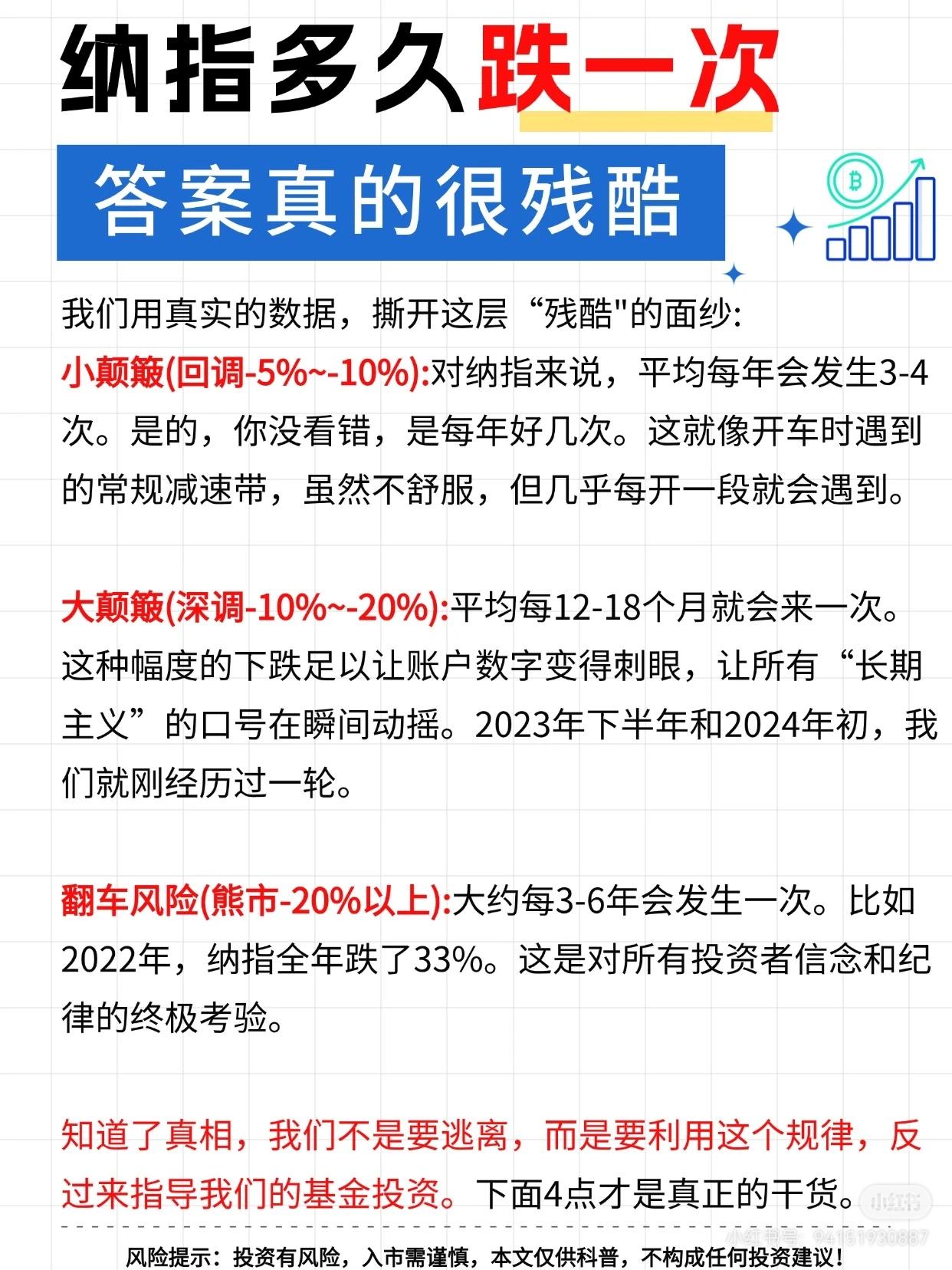 1. 六种炒股赚钱模式 图片列举了六种不同的股票投资方法,适合不同性格的人: * 空仓等大跌,买ETF:等待市场大跌时买入宽基ETF,反弹后卖出,赚取波段收益(15%-30%)。 * 专做一个股,反复做T:选择一个优质股,通过高抛低吸的波段操作降低成本,长期持有。 * 长期持有绩优股:在公司业绩好但股价低迷时买入并长期持有,等待上涨。 * 攒股收息:购买股息率高的国企/央企,靠分红获利。 * 反向布局:寻找无人问津的低价股,耐心等待价值回归和拉升。 * 与企业一起成长:投资市值小、前景好的公司,作为长期股东分享其成长红利。 2. 纳指的波动规律 用数据揭示纳指下跌是常态,而非例外: * 小颠簸 (-5% ~ -10%):平均每年发生3-4次。 * 大颠簸 (-10% ~ -20%):平均每12-18个月发生一次。 * 熊市 (-20%以上):大约每3-6年发生一次。 3. 如何面对波动(投资策略) 既然波动不可避免,应采取以下策略应对: * 重置预期:将下跌视为投资的常态,提前做好心理准备。 * 拥抱波动:利用定投策略,在下跌时买入更便宜的份额,摊平成本。 * 学会“看戏”:别把基金当股票频繁炒作,减少查看净值频率,做长期股东。 * 规划资金:只用未来3-5年都用不到的“闲钱”投资,确保能承受波动。 一句话总结: 投资(尤其是纳指这类高波动性资产)注定会频繁下跌,这不是选错产品,而是投资的“门票”。正确的做法是用闲钱、通过定投等方式拥抱波动,并调整心态,做长期持有者。