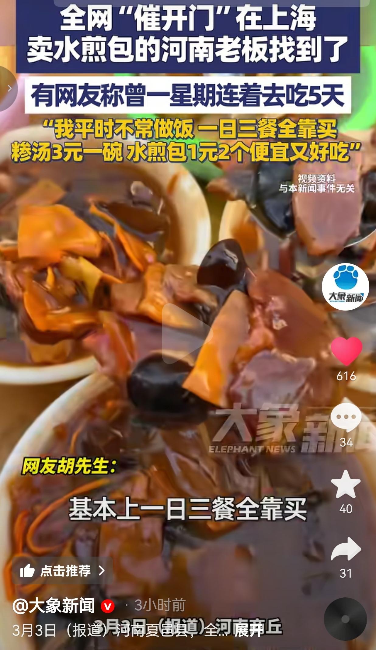 全网催开门!上海这家河南水煎包店,藏着打工人的续命早餐 最近上海有个事儿,把网友们都给整破防了。 一家开在上海的河南水煎包店,老板回老家过年了,结果这卷帘门一关,全网都在“催开门”。 有个叫胡先生的网友说,他平时不做饭,一日三餐全靠买,这家店的水煎包1块钱2个,糁汤3块钱一碗,便宜又好吃,他一个星期最多连着去了5天。 他说:“在上海这个寸土寸金的地方,能有这价格,跟我老家小地方的物价都差不多了,太良心了。” 网友看到后评论道: “这才是真正的烟火气,是打工人的底气。” 也有的网友说: “老板太实在了,这价格在上海,简直是慈善。” 还有的网友说: “想起了我妈做的水煎包,想家了。” 要我说,其实大家追的哪里只是一顿早餐啊。我们追的是不坑人、不套路、实实在在的人心。 是在高房租、高消费的大城市里,还能花几块钱,就被温柔接住的疲惫。是一口热乎饭下肚,瞬间觉得“今天我还能扛”的底气。 大城市不缺高档餐厅、不缺精致咖啡,缺的就是这种不看身份、不问贫富,谁都吃得起、吃得暖的小店。 老板用心做包子,打工人用真心捧场,这就是最朴素、最动人的人间烟火。 生活很难,打拼很累,可只要还有这样一家小店在,我们就知道:这座城市很温暖,没有把我们当外人。 对此,你有什么看法呢?欢迎大家评论区讨论留言。
