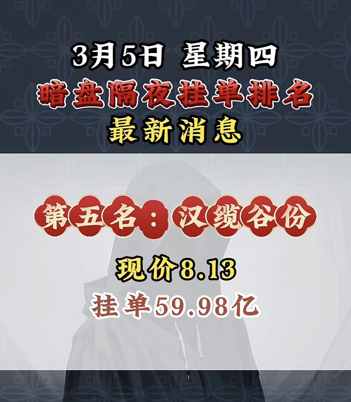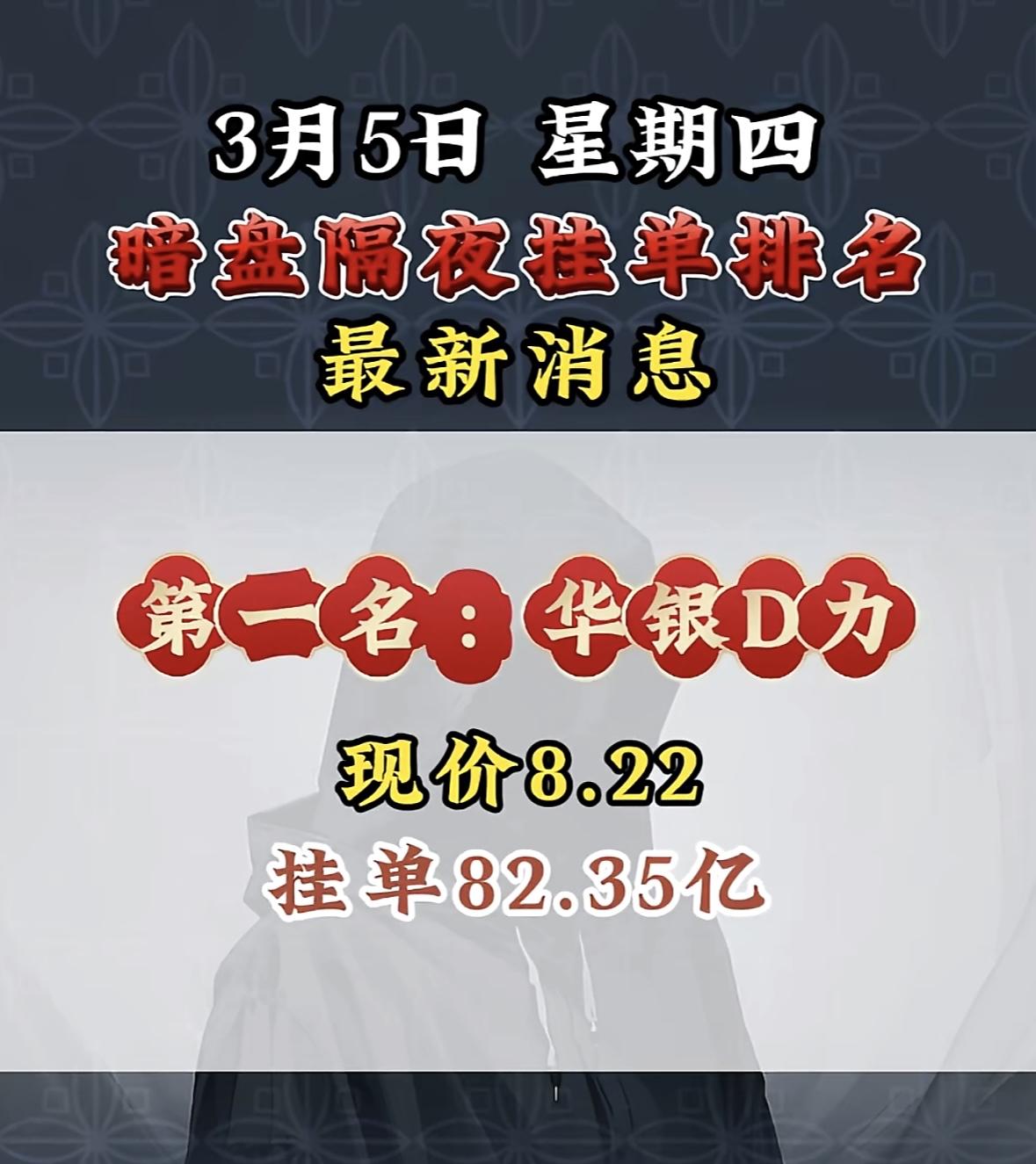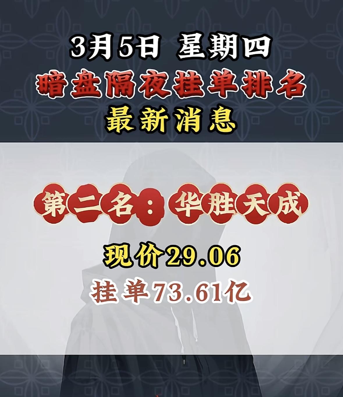 3月5日暗盘隔夜挂单前8名揭晓,这可太让人关注了。华胜天成尤其惹眼,现价29.06,挂单金额竟高达73.61亿,直接排到了暗盘隔夜挂单的第二名。这么高的挂单金额,说明不少人看好它啊。也许背后有啥利好消息,引得投资者纷纷出手。说不定之后股价会有大波动,要是涨起来,那些提前挂单的可就赚翻了。不过股市这东西,谁也说不准,也有可能出现意外。但这挂单情况确实给市场添了不少悬念,大家都在盯着华胜天成后续的表现呢。