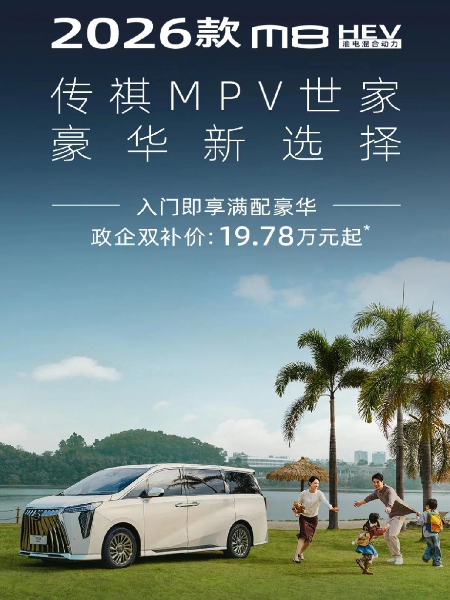 混动进阶,十九万级的全场景美好,2026款传祺M8 HEV动态行驶姿态稳健,2.0T混动系统加持,兼顾动力与节能,城市通勤、家庭出游皆能从容应对。 奔赴山海,亦守护日常;追求豪华,亦坚守性价比。2026款传祺M8 HEV,携19万级诚意而来,让混动豪华,成为生活的日常。 作为MPV世家的旗舰之作,传祺M8历经八代进化,始终锚定用户需求。从燃油到混动,从入门到高端,传祺用完整矩阵,满足每一份期待。80万用户的信赖,三冠王的荣耀,是前行的底气,更是不变的初心。 新车全面进阶,外观威严大气,座舱奢适温馨。2.0T混动系统,动力随踩随有,油耗经济亲民,告别里程焦虑,兼顾家用与商务。L2级智能驾驶,高速省心,城区安心,轻松驾驭复杂路况。 空间宽绰从容,7座布局灵活多变,全家出行不拥挤。二排头等舱座椅,是移动的休憩空间;全新内饰配色,提升座舱格调;主副驾按摩功能,让驾乘变成享受。360度安全气囊、超长侧气帘,把安全武装到每一处。 最动人的,是19.78万起的定价。加配不涨价,入门即满配,把技术红利、成本优化,全部回馈给用户。没有高不可攀的价格,只有触手可及的美好;没有华而不实的配置,只有实用贴心的设计。 这是属于中国品牌的诚意,是属于万千家庭的福利。2026款传祺M8 HEV,以超高质价比,解锁全场景出行,让每一次出发,都满载温暖与体面。