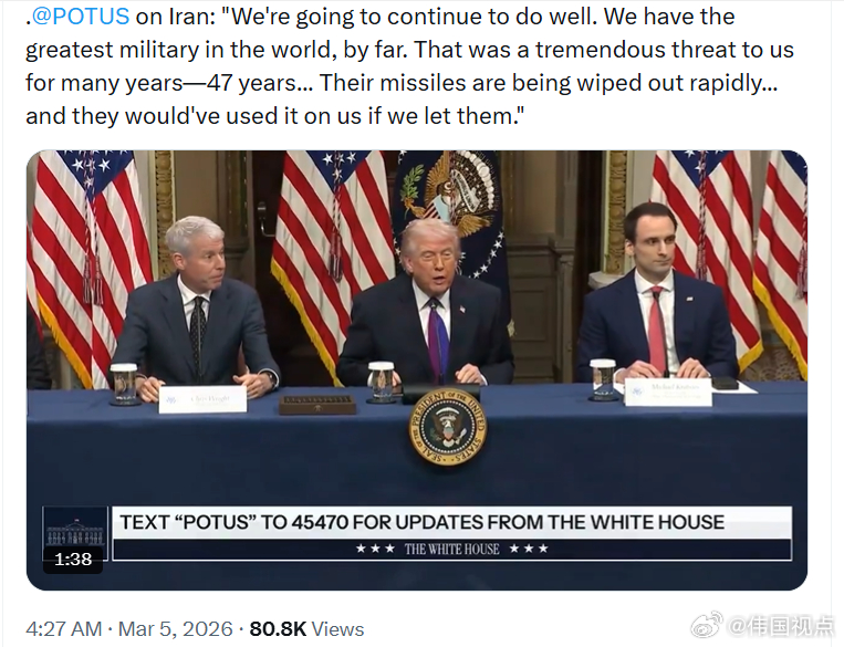 特朗普总统谈到伊朗时说:“我们将继续做好应对。我们拥有世界上迄今为止最强大的军队。多年来——47年……那对我们构成了巨大的威胁……他们的导弹正在迅速被消灭……如果我们放任不管,他们本来会用这些导弹对付我们。”
