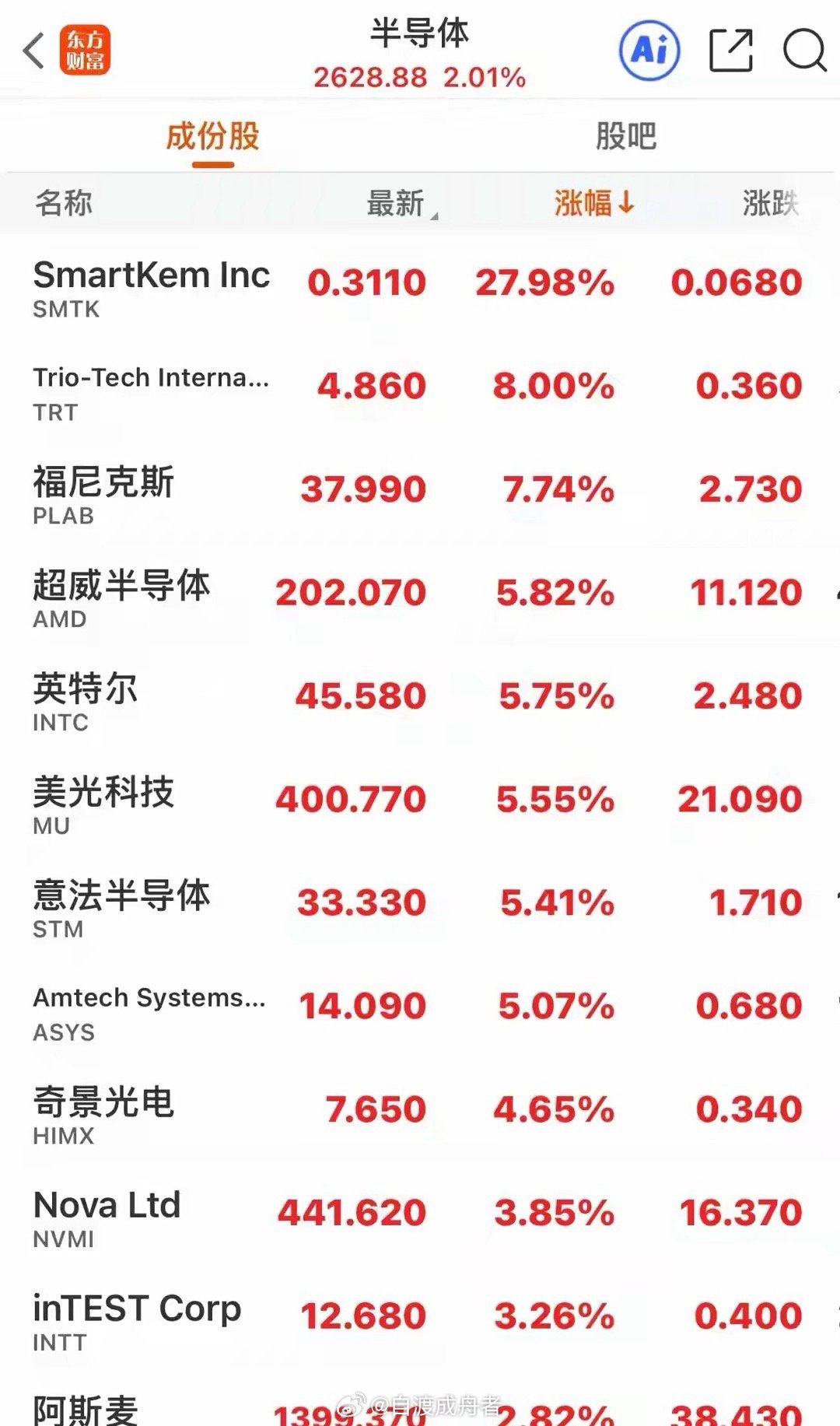 美股的表现同样可圈可点。道琼斯、纳斯达克、标普三大指数开盘后虽经历短暂跳水,但很快被买盘拉回,最终分别上涨0.49%、1.29%、0.78%。细分板块中,半导体、储存芯片、机器人等赛道成为绝对主角:SMTK跳空大涨28.40%,超微半导体、英特尔等巨头紧随其后,涨幅均超5%;储存芯片和机器人领域的闪迪、MOB等个股也表现亮眼,资金对科技成长股的追捧可见一斑。