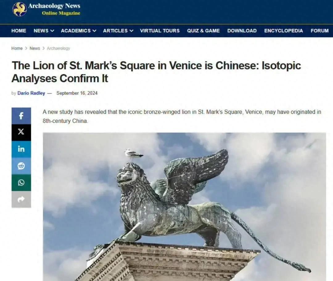 意大利人彻底破防了!他们捧了七百多年的“城徽”、威尼斯圣马可广场上那尊威风凛凛的飞狮,居然被自己家的顶尖学府用高科技手段扒了个底掉。帕多瓦大学2025年9月发布的铅同位素检测报告白纸黑字写着:雕像身体部分的铜矿石,来自中国长江中下游的古矿坑。这不是什么文化碰瓷,这是科学数据直接拍在脸上的实锤,容不得半点反驳。 消息一出,整个欧洲考古圈都沉默了,但意大利网友可没消停,评论区直接炸了锅。要知道这尊飞狮可不是普通雕塑,它1293年就蹲在广场上了,拿破仑当年战败都得乖乖把它还给威尼斯。今天威尼斯电影节的“金狮奖杯”原型就是它,在意大利人心里的地位,相当于咱们的后母戊鼎配上《清明上国图》,那是写进基因里的民族图腾。现在你告诉我,这祖宗是“中国造”?这心理落差谁能扛得住? 但更扎心的细节还在后头。研究团队发现,飞狮的翅膀和身体材质完全对不上号——身体是中国的铜,翅膀是欧洲本地后加的。这就意味着,当年某个威尼斯工匠手里捧着一尊来自东方的青铜兽,琢磨了半天,咔嚓切掉兽角、磨圆耳朵,又给它焊上一对翅膀,硬生生把唐朝的镇墓兽改造成了圣马可的护法神。这哪是什么文化传承?这就是赤裸裸的文物改装现场,是700年前的全球化山寨操作。 别急着说这不可能,咱们翻翻史料就知道,这事儿在当时就是常规操作。马可·波罗他们家那趟东方之旅,带回威尼斯的可不止是游记里的神话故事,更有实打实的硬通货。阿拉伯史书里清清楚楚记载着“中国剑”如何削铁如泥,日本寺庙里成堆的宋钱至今还在展出,“南海一号”沉船里打捞出上百吨铁锅铜器,数量比瓷器丝绸还多。这说明什么?说明在宋元时期,中国金属产品就是国际贸易界的硬通货,是海上丝绸之路的压舱石。 有人可能要杠了:那也不能证明飞狮就是中国的啊?好,咱们上硬核数据。铅同位素检测是什么概念?这就相当于给金属做DNA鉴定,每个矿坑的铅同位素特征都是独一无二的。帕多瓦大学第一次检测完自己都不信,又复测了一次,结果还是指向中国长江流域。唐代镇墓兽大多是陶的、石的,但也有青铜材质的小型明器流传海外,西域商人带着它沿着丝绸之路一路西行,最后在威尼斯被重新浇筑放大,完全符合历史逻辑链条。 这事儿真正炸裂的地方,其实不在于争一个“文物归属权”,而在于它直接把“西方中心论”的那层窗户纸给捅破了。长期以来某些西方学者总爱鼓吹青铜技术“西来说”,仿佛中华文明处处都等着外人来启蒙。结果呢?威尼斯城徽亲自给你上课:早在七百年前,中国的铜料就顺着海路流向了欧洲腹地,还被当宝贝供了起来。那些傲慢的历史叙事,在这尊飞狮面前,就是一戳就破的纸老虎。 接下来这出大戏还没完。随着科技考古的手段越来越硬核,未来会有更多“欧洲国宝”被扒出东方血统。法国卢浮宫里的某件青铜器、德国大教堂里的某尊雕像、英国博物馆里的某块金属残片,很可能都会在铅同位素检测仪面前现出原形。到那时候,整个西方博物馆的叙事体系都得推倒重来,咱们就搬好小板凳,等着看一场接一场的“认祖归宗”大戏吧。