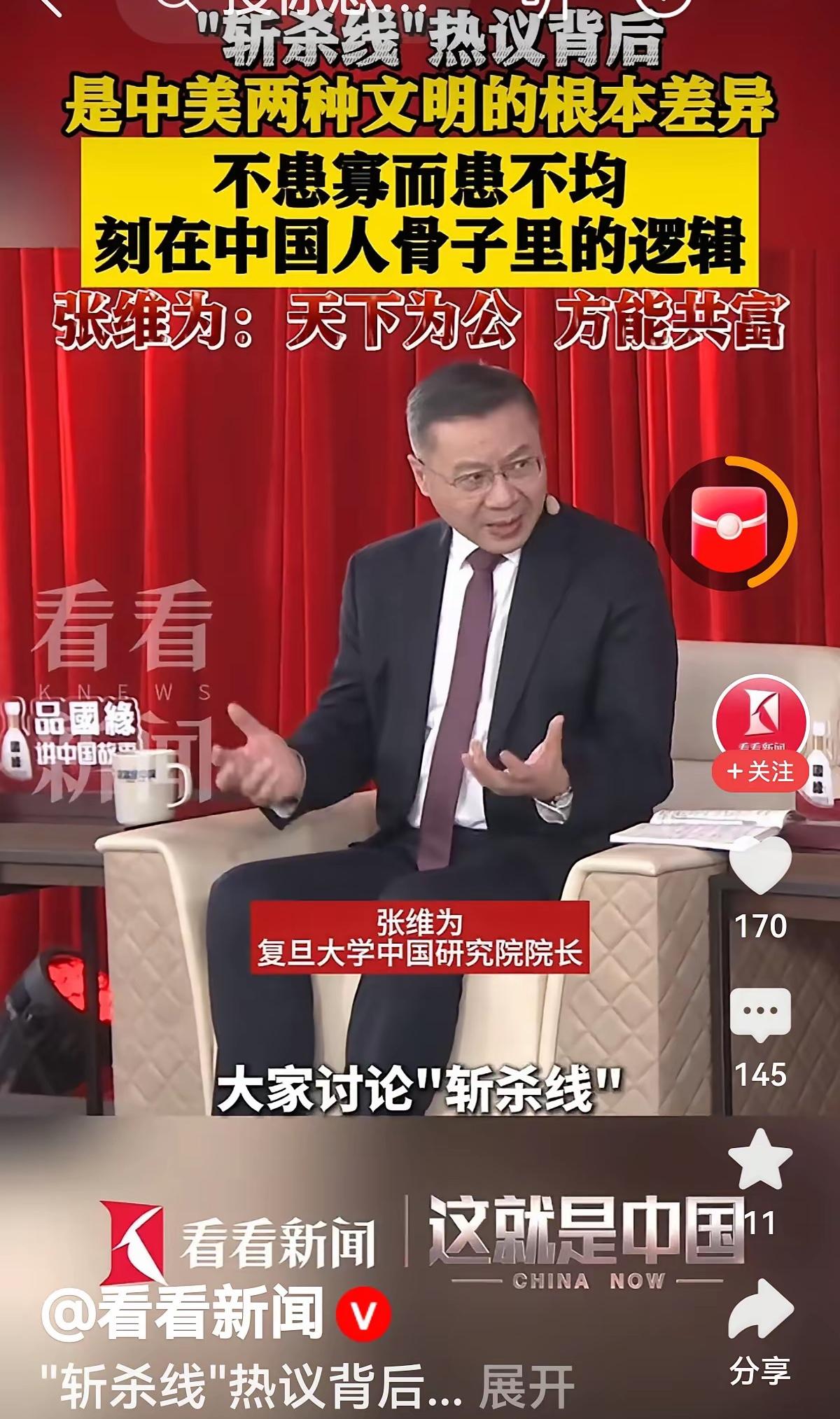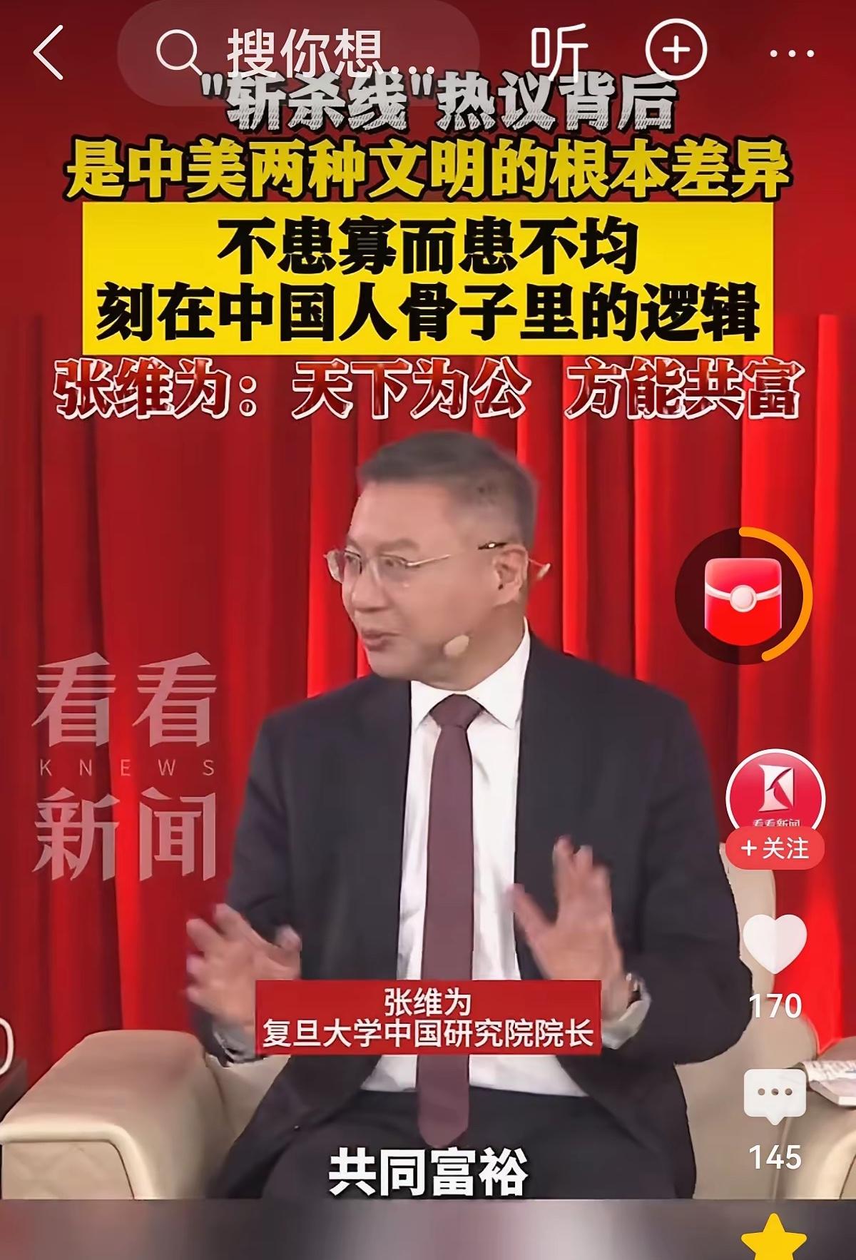 复旦著名爱国教授张维为罕见地没有发表对美帝打击伊朗的评论。 张教授为何最近这么低调了呢? 但他还是评论了斩杀线理论。 自从牢A发明了斩杀线理论之后,引发了激烈的讨论。 美帝又向深渊迈进了一大步。 复旦大学著名爱国正能量教授张维为对此评论说: 这是中美两种不同文化的差异。 我们是为公的文化,美帝刚好相反。 不患寡而患不均,是刻在中国人骨子里的逻辑, 只有天下为公,才能实现共同富裕。 为何这么一个爱国教授,天天正能量,讲好中国故事,建立中国民族信心的人; 被一些网友攻击和谩骂,太不可思议了。 张教授说的对,最终,美帝必亡,我们必胜,教授继续加油!