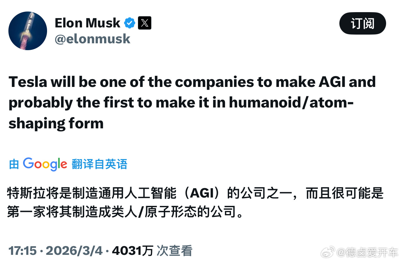马斯克表示:“特斯拉将会是实现 AGI的公司之一,而且很可能会是第一家以人形机器人/具备原子级物理改造能力的形态实现 AGI 的公司。”