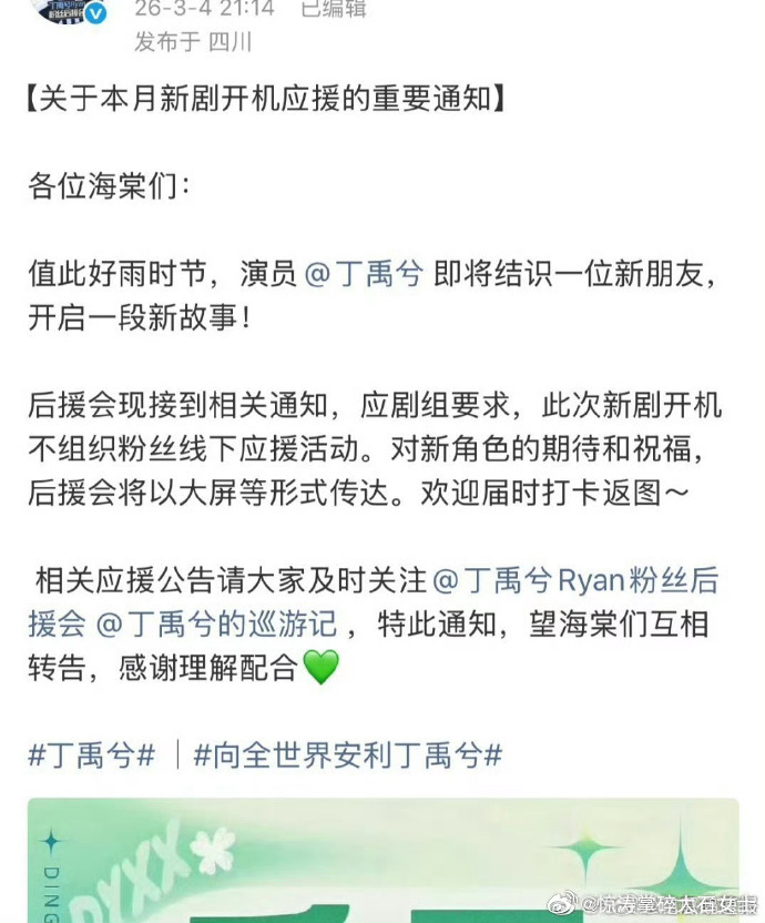 丁禹兮司宫令本月开机丁禹兮司宫令没有开机应援 《司宫令》本月开机!丁禹兮主演新剧启动,按剧组规定无开机应援,期待用心打磨的作品!