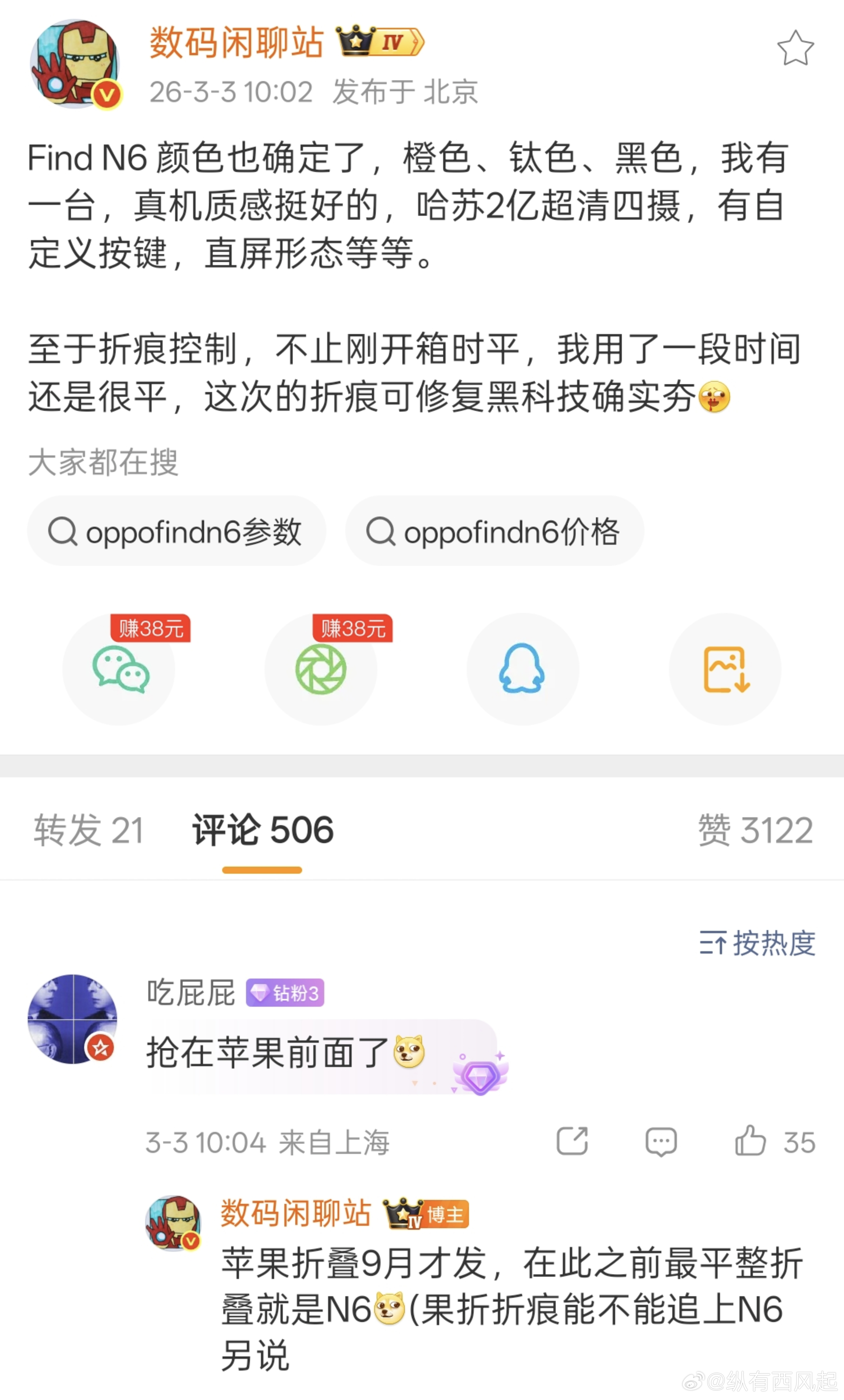 未来半年内没有折叠机的折痕控制可以达到Find N6水平,苹果折叠屏折痕情况未知,不过据说借鉴了Find N5,难道落后一代?