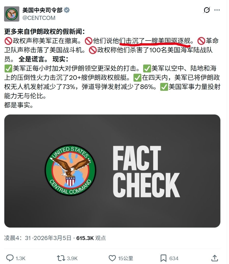 美国中央司令部发文进行了否认,但是否认的是“击沉(sank)”,而非“击中(hit)”。