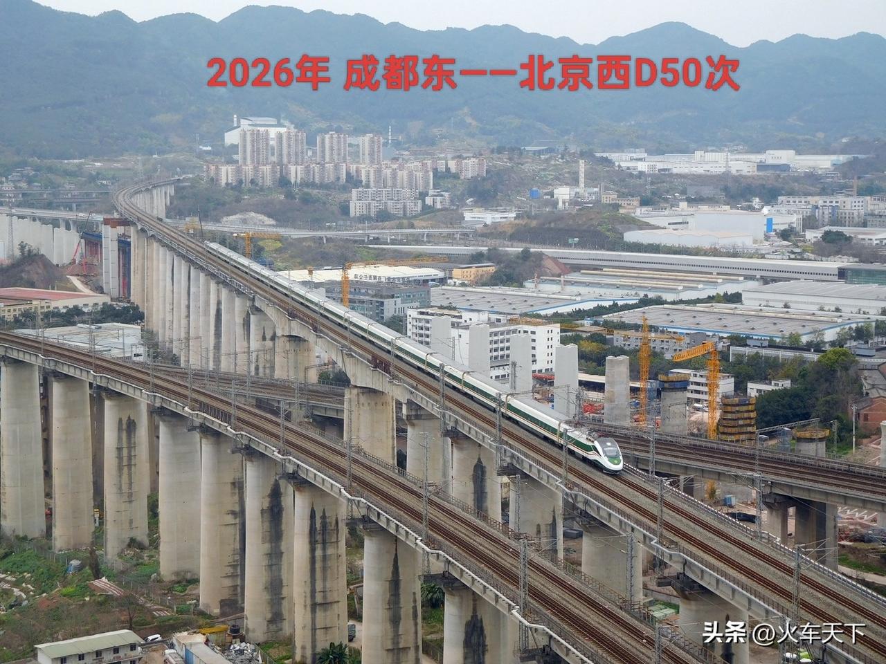同一处地方相隔十年拍摄的图片,第一张是当时成都开往北京西的Z50次列车与一列重庆北到成都东的高速动车组。第二张是现在拍摄的,两年前Z50次列车被相同速度的动力集中式动车组CR200J—C替换,车次改为D50次,内饰有一些提升,票价也提升了,当然最高运行时速还是160公里。十年前成渝高铁刚刚建成,只是重庆北去成渝高铁的列车需要走一段联络线,现在成渝中线高铁也在建设中了。