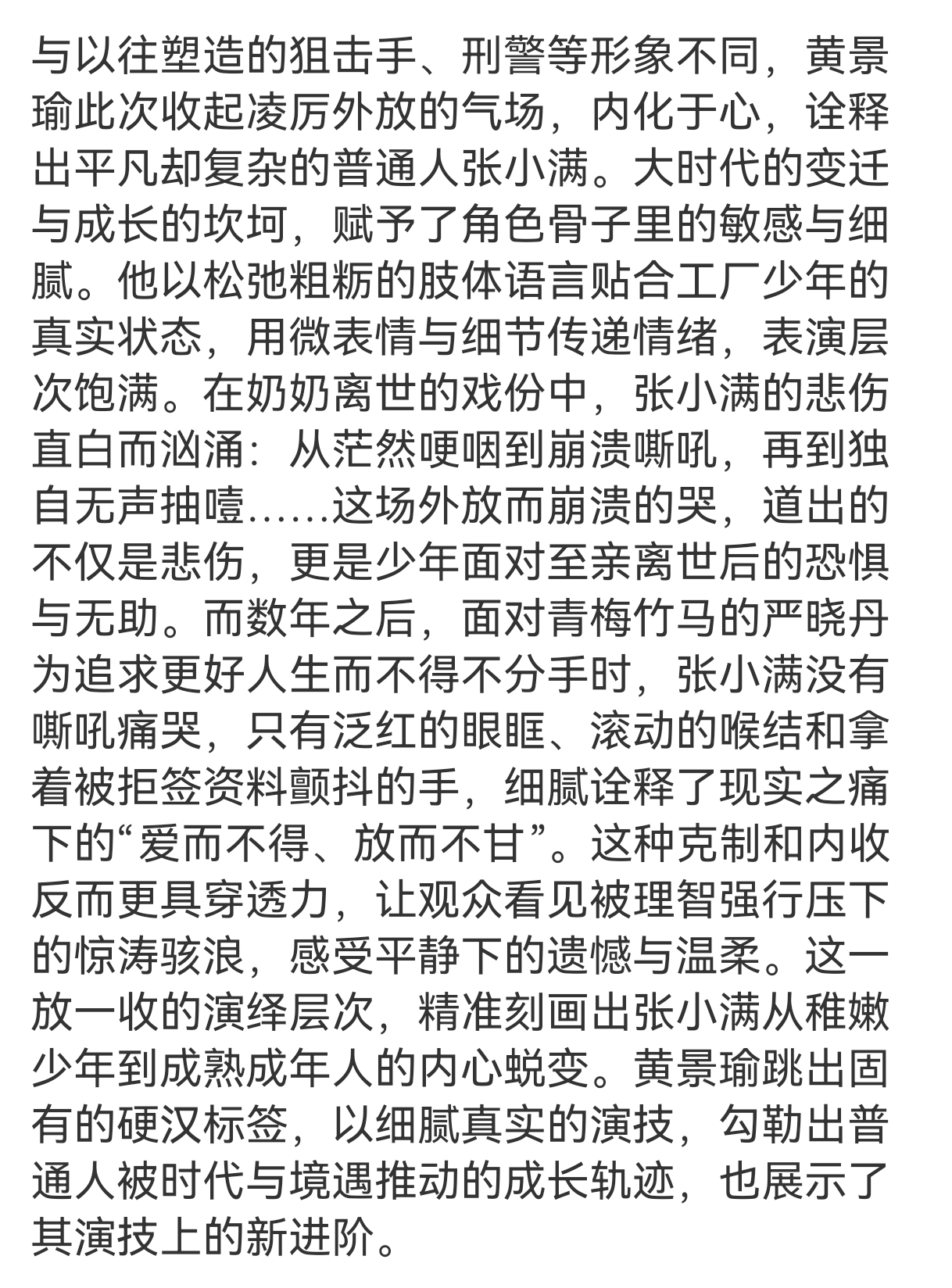 黄景瑜谈年代剧珍贵之处 《岁月有情时》前22集苦不苦?虐不虐?我追剧时说过,我的真实体验就是玻璃渣子拌着糖往下咽的!我是一个唯爱爽剧,不爱看苦情戏的人,能坚持看下来,就是因为张小满打动了我,让我关心他的命运。经济繁荣的年代,大家喜欢看苦情戏忆往昔,这样会觉得自己现在的生活幸福感倍增,而眼下经济下行时期的观众,现生多艰,爱看爽剧,是因为想给生活找个气口让自己暂时放下疲惫做一个梦,这都是自然选择!无关对错!但好的作品,生命力是可以穿透周期的,《岁月有情时》这部剧,不仅男主张小满的演绎超越预期的精彩,哪怕是苦情的部分都洋溢着乐观向上,积极进取从不言败的精神力量,导演镜头语言,美术设计,服化道,包括剧本对群像的刻画都非常鲜活和各具特色,这部剧是可以穿越周期,被反复观看细品的好剧!央视网评黄景瑜演技
