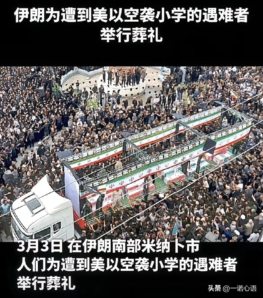 伊朗在为160个儿童举行葬礼,看现场密密麻麻的人,我真为他们捏一把汗。 这要是美以来一轮轰炸,那伊朗岂不是要灭国? 有人说他们不敢! 如果不敢,那这一百多个孩子怎能齐刷刷的倒下? 看到这么多鲜活的生命,变成了冰冷的尸体,全世界的人都感到心痛无比,难道特朗普的良心不会痛吗? 天理轮回,因果报应,美以这种无差别屠杀,老天爷不会看不到吧? 安息吧!孩子们,一路走好! 天堂无战争,你们在那里会得到永生!