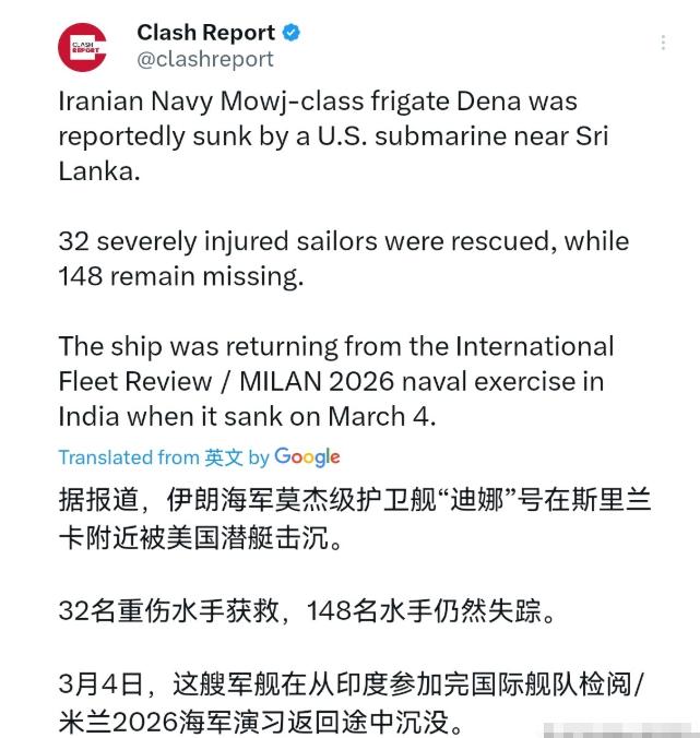 血海深仇!伊朗军舰刚参加完印度举行的多国海上联合演习,就遭到美国的潜艇的伏击,死亡或达100人以上! 根据斯里兰卡方面和多家媒体的消息,这事儿发生在3月4号凌晨,地点在斯里兰卡南部加勒港以南大约40海里的公海上。当时舰上总共有180名船员,一阵猛烈的爆炸之后,这艘1500吨的伊朗国产主力舰迅速沉没。 斯里兰卡海军倒是反应挺快,接到求救信号后立马派了船和飞机去救人,最后捞上来32个重伤员,还有80多具遗体。算下来,101个人失踪,78个人受伤,这伤亡率超过九成,基本上算是被一锅端了。 美国国防部长赫格塞思在3月5号的发布会上,大大方方地就承认了,就是美军潜艇干的,还得意洋洋地宣称这是“二战以来美军潜艇首次用鱼雷击沉敌方舰艇”,一副“就是我干的,你能拿我怎么样”的架势。 你可能会问,美国为啥要下这么狠的手,在公海上击沉别国的军舰?这可不是一时兴起,而是蓄谋已久,背后藏着两个明晃晃的动机。头一个,就是赤裸裸的报复。 从2月28号开始,美国和以色列就对伊朗发动了大规模的空袭,用他们自己的话说,叫“史诗怒火”行动,目标就是要“彻底摧毁伊朗海军”。 到3月初,美军中央司令部司令库珀宣称已经打击了伊朗近2000个目标,摧毁了17艘伊朗军舰。伊朗也不是吃素的,立马用弹道导弹和无人机反击,袭击了美军在中东的多个基地,还宣称造成了美军伤亡。 所以,美国挑这艘刚从国际演习回来的“德纳”号下手,就是在杀鸡儆猴,用最直接、最血腥的方式告诉伊朗:你敢动我的船和基地,我就让你的军舰有去无回,而且专挑你刚露完脸、最没防备的时候打,让你在国际上把脸丢尽。 这第二个动机,就更阴险了,那就是要彻底废掉伊朗海军的武功,特别是它封锁霍尔木兹海峡的本事。霍尔木兹海峡那可是全球石油运输的命脉,全世界差不多三分之一的油轮都得从那儿过。 伊朗手里最大的牌之一,就是能在关键时刻掐住这个脖子。之前伊朗已经放话,完全控制了霍尔木兹海峡,禁止任何油轮通过,好几艘想硬闯的船都挨了打。这一下子,国际油价就跟坐了火箭似的往上窜。美国当然不能容忍伊朗捏着自己的能源命门。 所以,击沉“德纳”号这样的主力护卫舰,只是整个“拆海军”计划的一部分。美国的算盘打得精着呢:把伊朗那些能出海打仗的大船一艘艘敲掉,比如“贾马兰”级护卫舰、“沙希德·巴盖里”号无人机母舰,让它的大型舰队瘫痪。 这样一来,伊朗就算想封锁海峡,也只能靠些快艇、水雷和岸基导弹这些小打小闹的手段,威慑力就大打折扣了。说白了,美国就是要用绝对的军事优势,把伊朗伸向海洋的爪子一根根剁掉,让它以后只能在波斯湾里扑腾,再也威胁不到国际航道。 美国这一刀,捅得是又狠又准。你想想,这艘“德纳”号2月份还在印度跟各国海军搞联谊,参加国际舰队检阅,一副融入国际大家庭的样子。结果一离开印度洋,就在返航的半道上被伏击沉没。这不仅仅是损失一艘船、死一百多号人的问题,这简直是把伊朗的脸面按在公海的海水里摩擦。 以后哪个国家还敢放心跟伊朗搞联合军演?这不是明摆着告诉全世界:跟伊朗走得太近,小心被美国盯上,连怎么死的都不知道。对于伊朗来说,这绝对是奇耻大辱,是血海深仇。自家造的、才服役五年的主力舰,就这么没了;一百多个家庭瞬间破碎。这口气,伊朗怎么可能咽得下去? 所以,这事儿根本没完。伊朗已经展开了猛烈的报复,向以色列和美国基地发射了大量导弹和无人机。美国虽然摧毁了伊朗不少军舰,但要想真正控制住那条狭窄的海峡,光靠炸沉几艘大船是远远不够的。 伊朗还有成千上万艘武装快艇,有不知道布在哪里的水雷,有藏在海岸山洞里的反舰导弹。这场较量,已经从军舰对军舰的正面PK,变成了美国的高科技舰队对阵伊朗的“海上麻雀战”。 美国想用雷霆万钧之势速战速决,而伊朗则打算用持久的不对称消耗,让美国及其盟友付出难以承受的经济和政治代价。击沉“德纳”号,与其说是一场战斗的结束,不如说是另一场更复杂、更残酷博弈的开始。这血海深仇已经结下,接下来的印度洋和波斯湾,恐怕再也无法平静了。