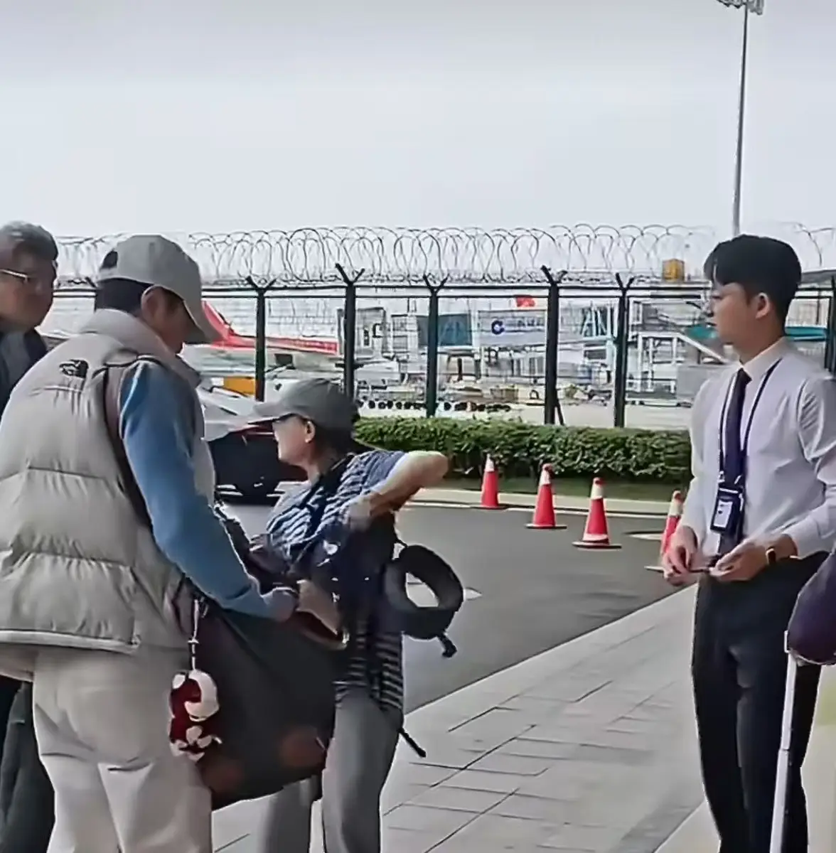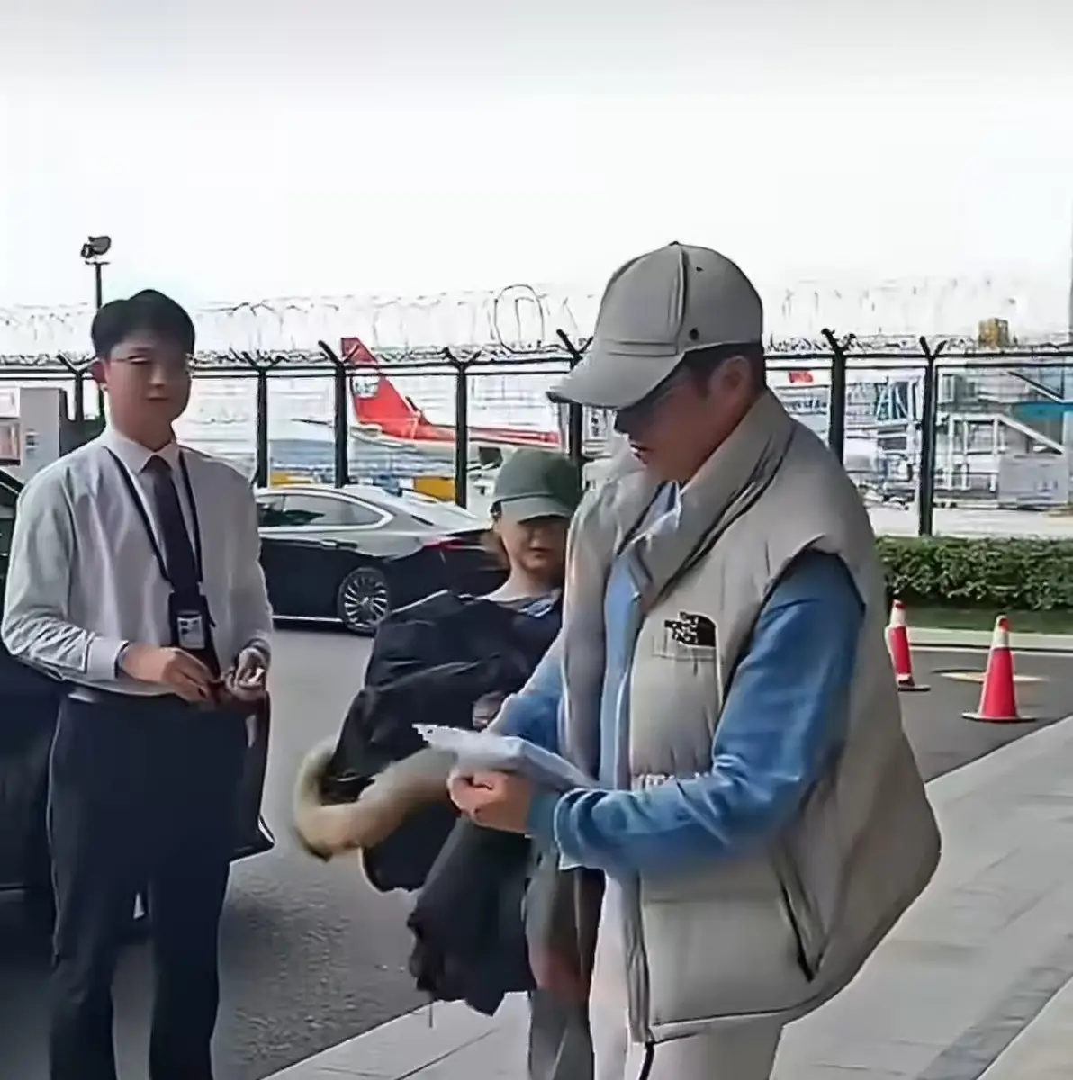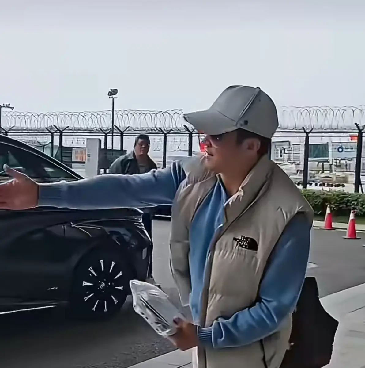 吴京穿浅蓝卫衣戴棒球帽现身机场 送粉丝唇膏宠粉又接地气