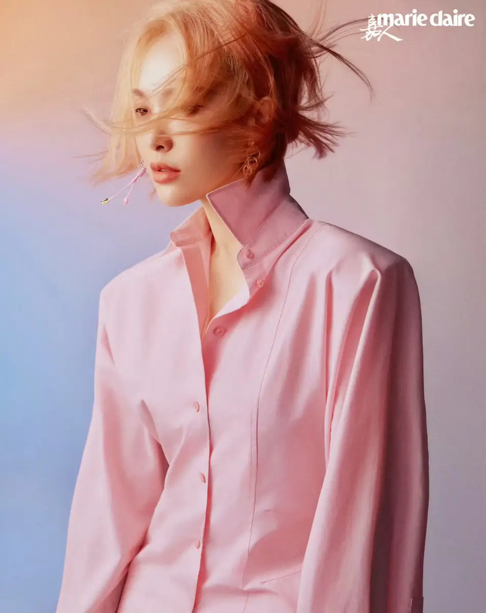 唐嫣穿粉色衬衫温柔知性一头金发又甜又飒