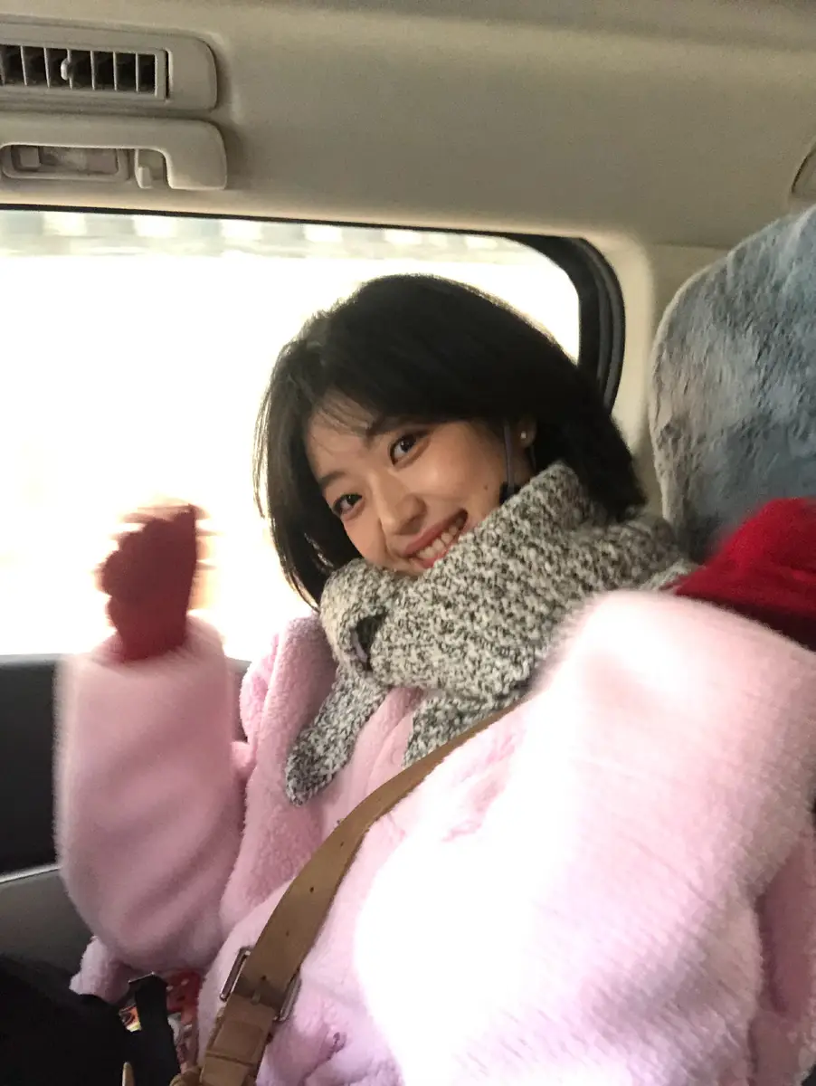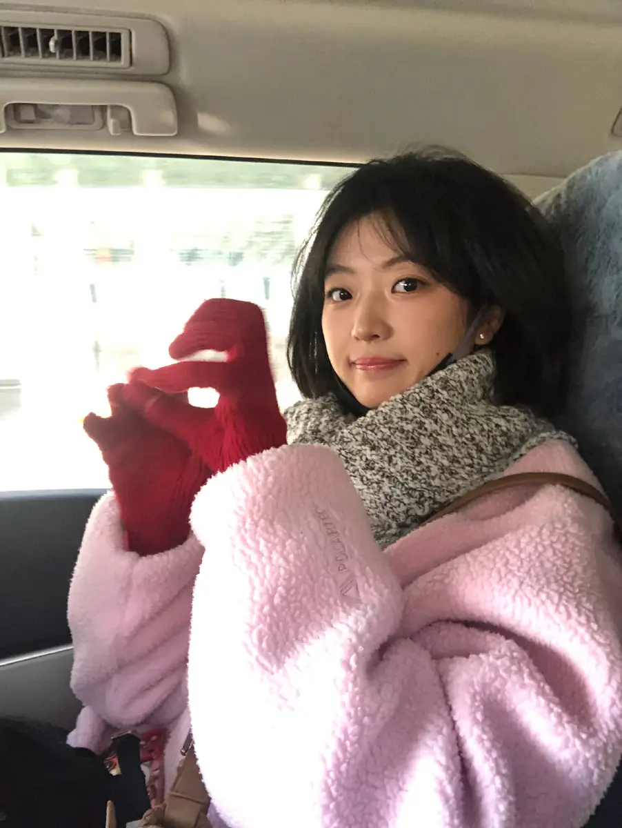 孙千裹粉外套围围巾笑眼弯弯超治愈 戴红手套比耶俏皮又灵动