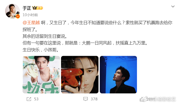 于正买机票去看王星越了于正买机票去看王星越了,特地给我们的小孩哥庆祝生日! 真的是满满的一份用心了呀,太期待了! 于正给王星越庆生
