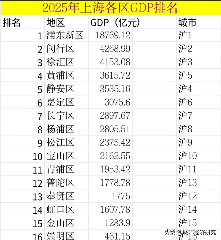 2025上海市各区GDP排名水平情况,图片里属于2025年上海各区的GDP排名,浦东新区GDP排名榜一,闵行区GDP排名榜二,徐汇区GDP排名榜三,上海的网友们可以看看自己所在区2025年GDP排名情况怎么样。