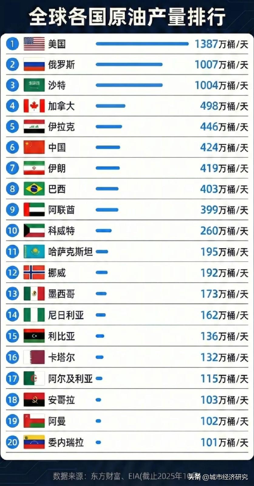 全球原油产量前二十国家排名情况,图片里属于全球原油产量前二十国家排名,美国原油产量排名榜一,中国原油产量排名前六,全球前二十国原油产量都达到了一天100万桶以上的水平,可见全球原油产量前二十国家个个产油量水平都挺不错的。