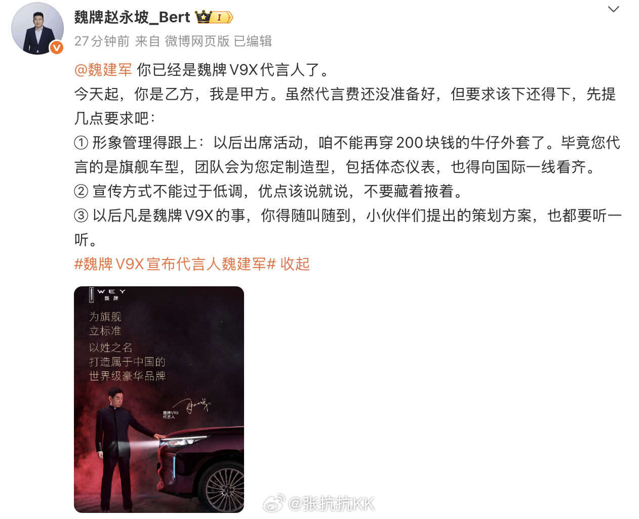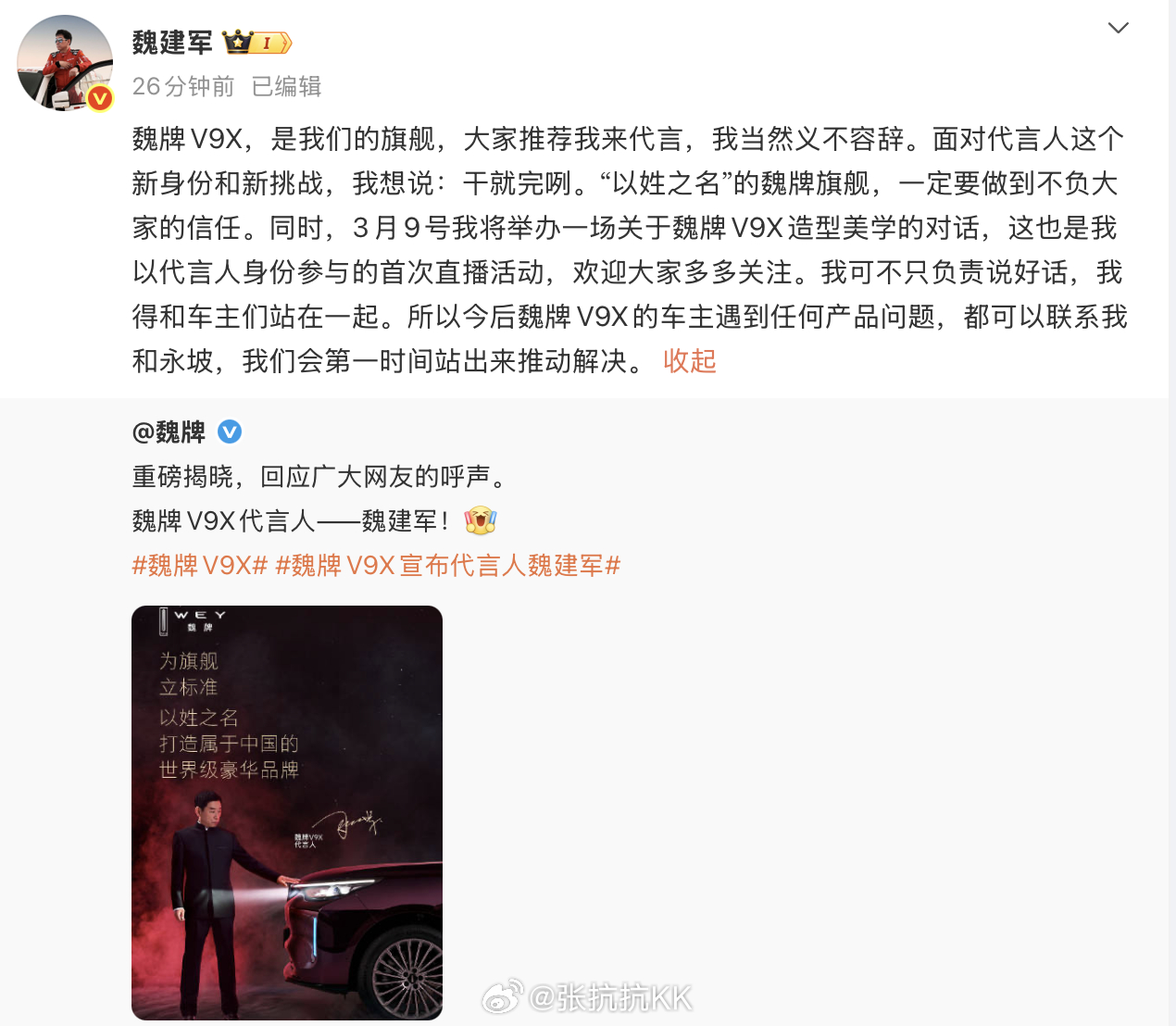 官宣了,魏建军亲自代言魏牌V9X。就IP价值来说,魏总这两年在车圈的露出频次,远超一般明星。
