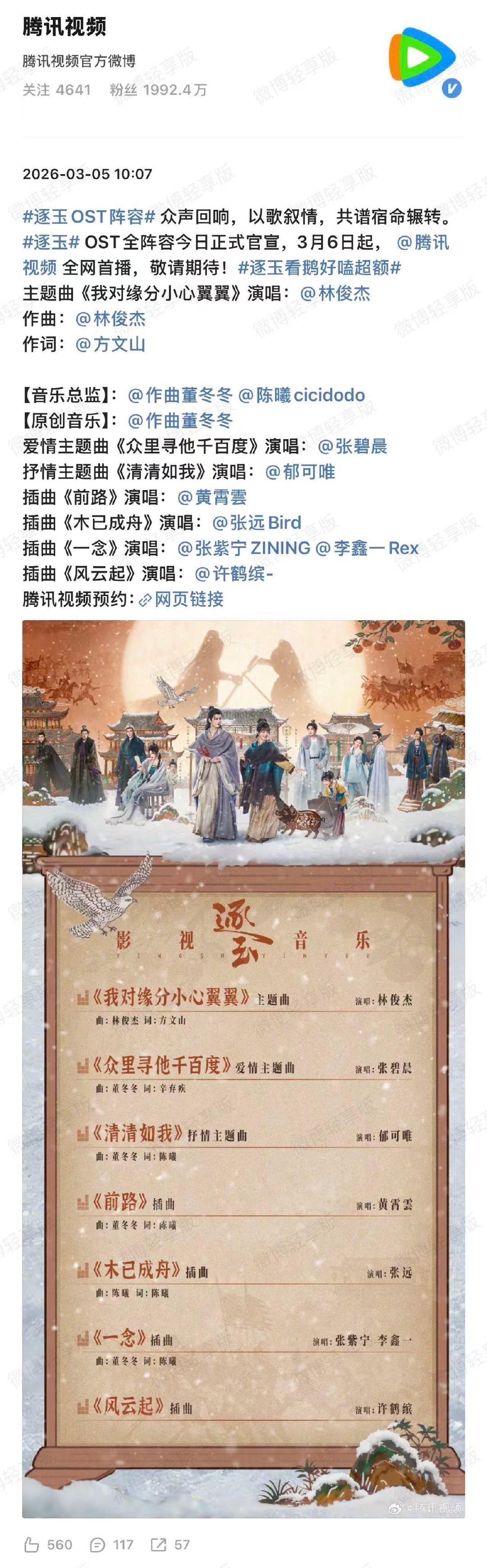 逐玉ost全阵容官宣逐玉ost阵容好豪华3月5日,由领衔主演的《逐玉》ost全
