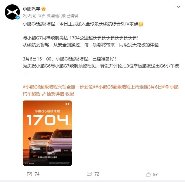 刚收到消息!小鹏G6增程版明天下午3点开卖,六项全能一步到位 这台车去年10月就上了工信部,但一直憋着没发。 先看硬参数:4771mm长、2890mm轴距,定位中型轿跑SUV。 搭载亿纬动力磷酸铁锂电池+东安动力1.5T增程器(110kW)。 数据中规中矩,但真正的杀手锏在后面—— 全域800V高压碳化硅平台+5C超充AI电池+混合碳化硅同轴电驱+静音增程器(运行噪音仅1dB)! 1dB是什么概念?图书馆是40dB,夜深人静的房间是20dB,1dB基本等于“你根本听不见”🤫 小鹏一直标榜纯电,现在杀进增程赛道,能成功吗? 明天下午3点,价格见分晓[狗头]