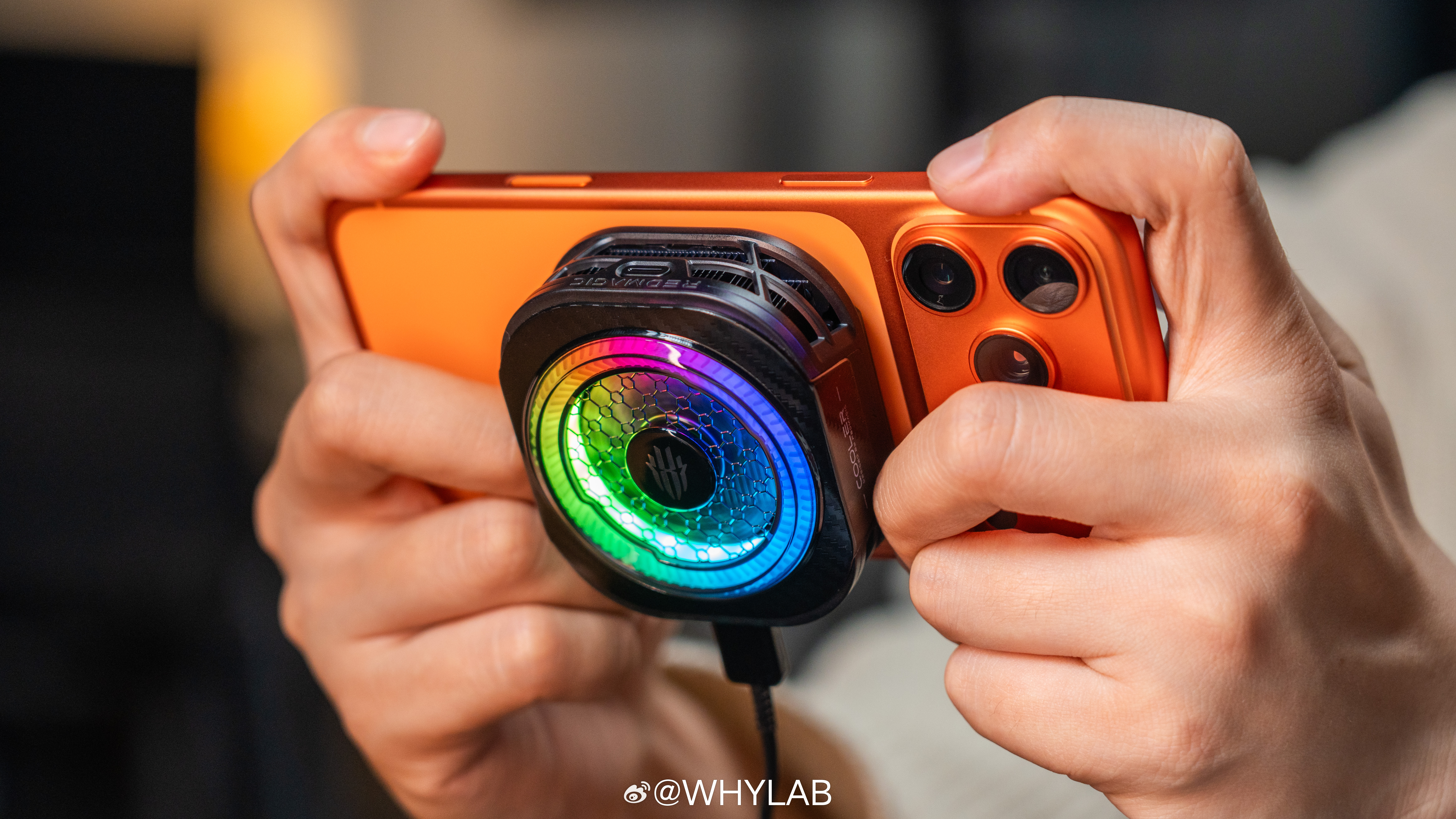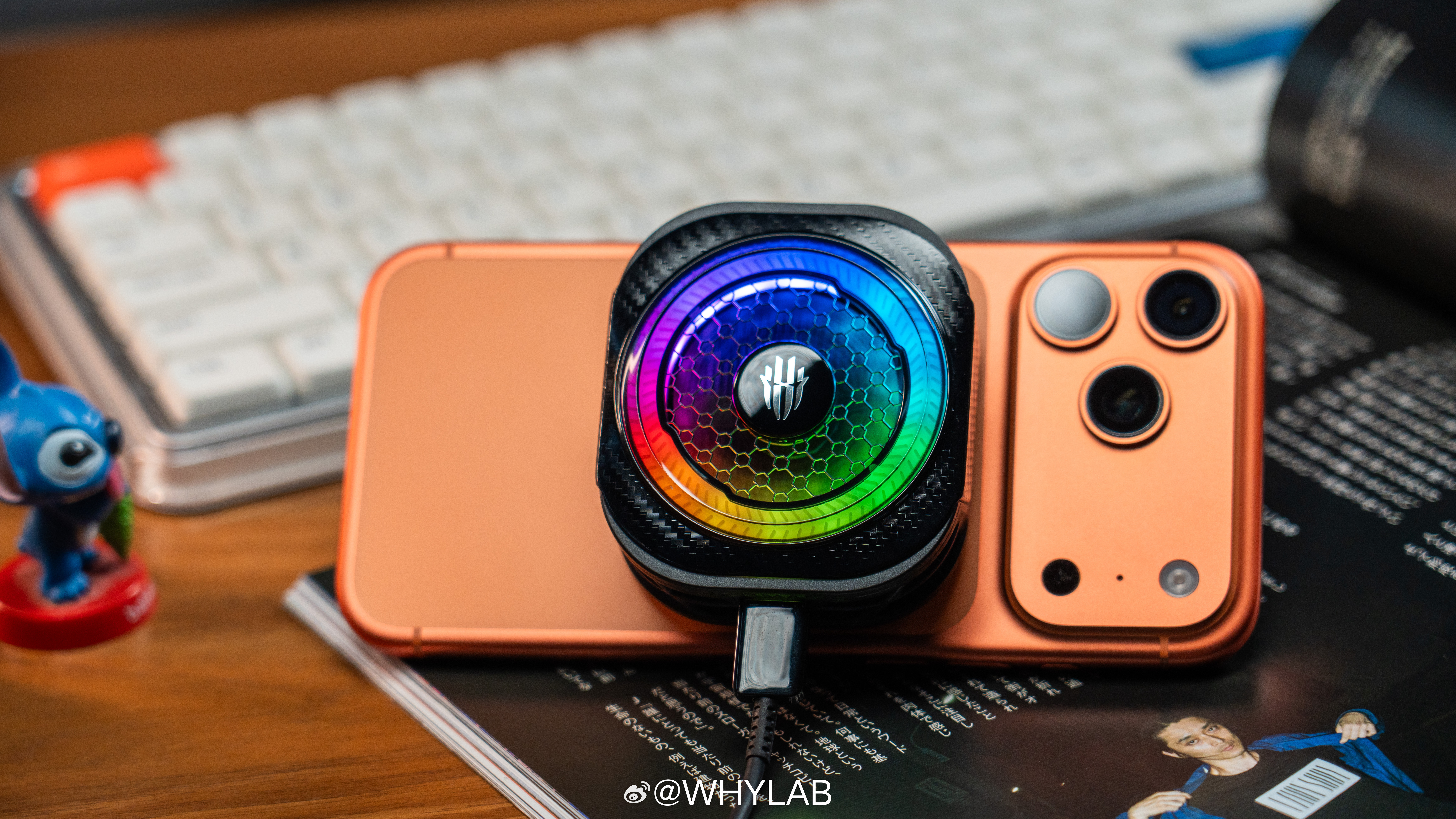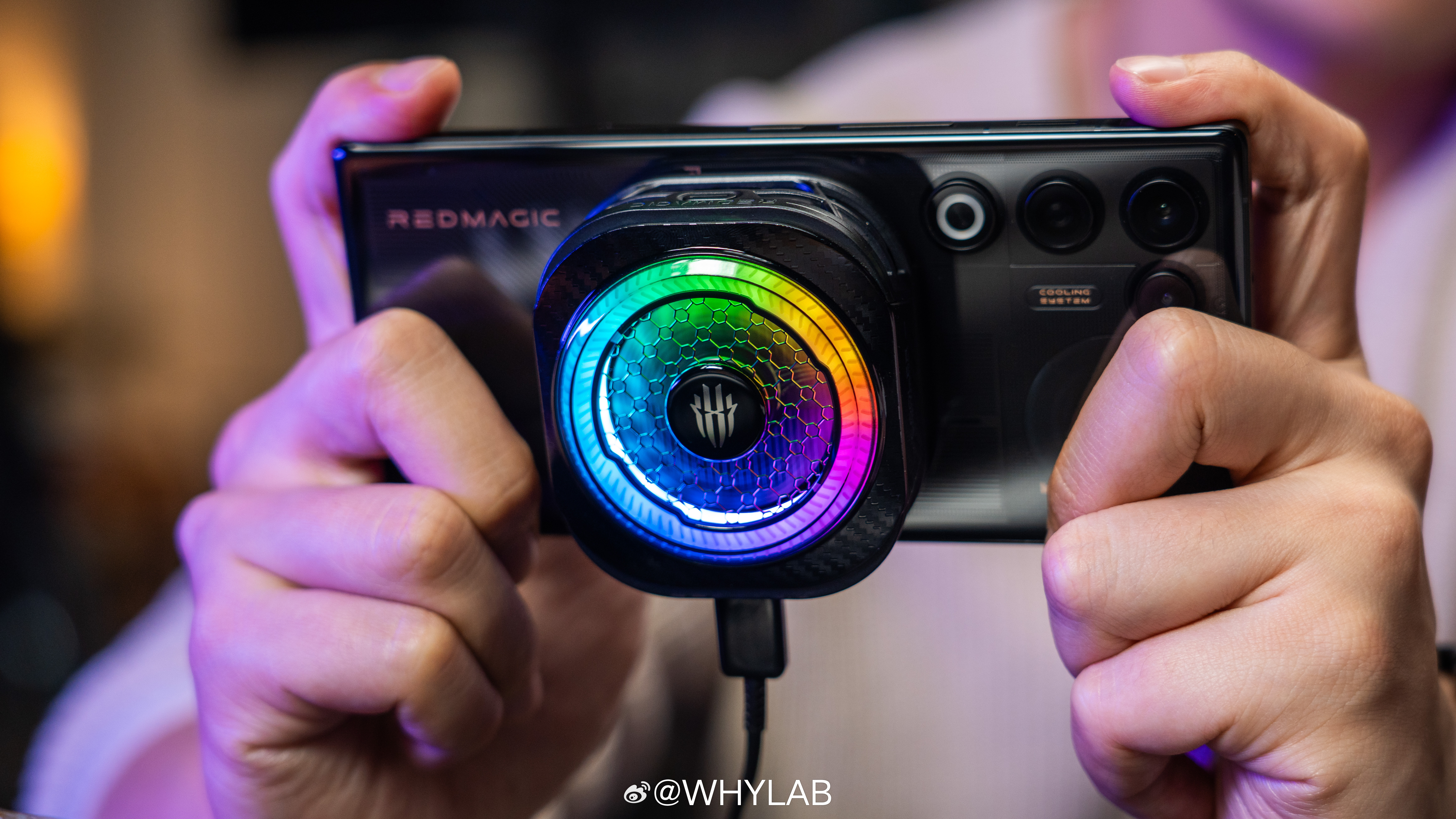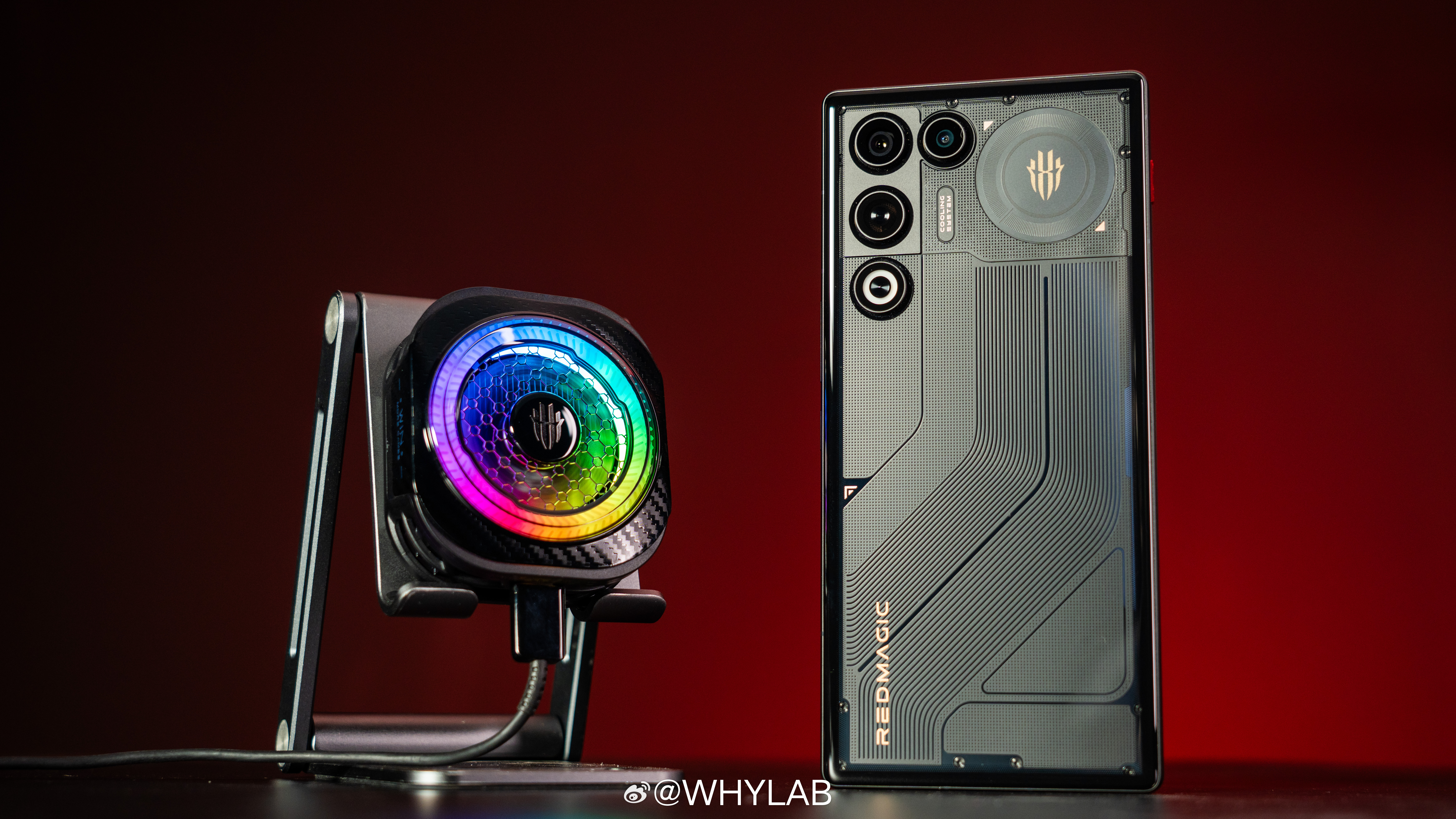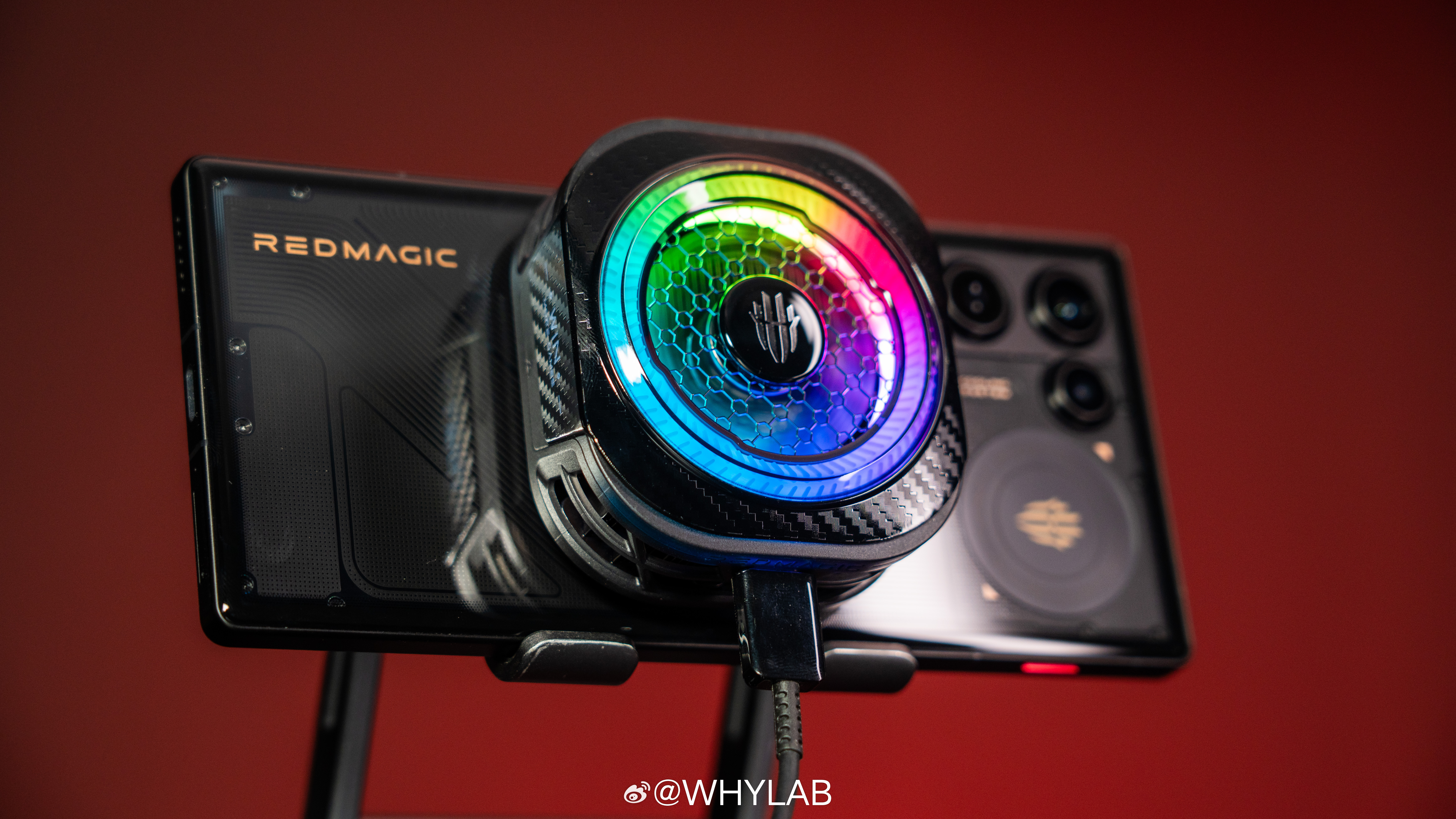 WHYLAB图赏拿到红魔散热器8 Pro,外观我觉得没什么可挑的,电竞感很足,还有RGB氛围灯,支持六种灯效可调,降温启动后,散热器会从黑色变成宝蓝色,一开就很有内味儿。
