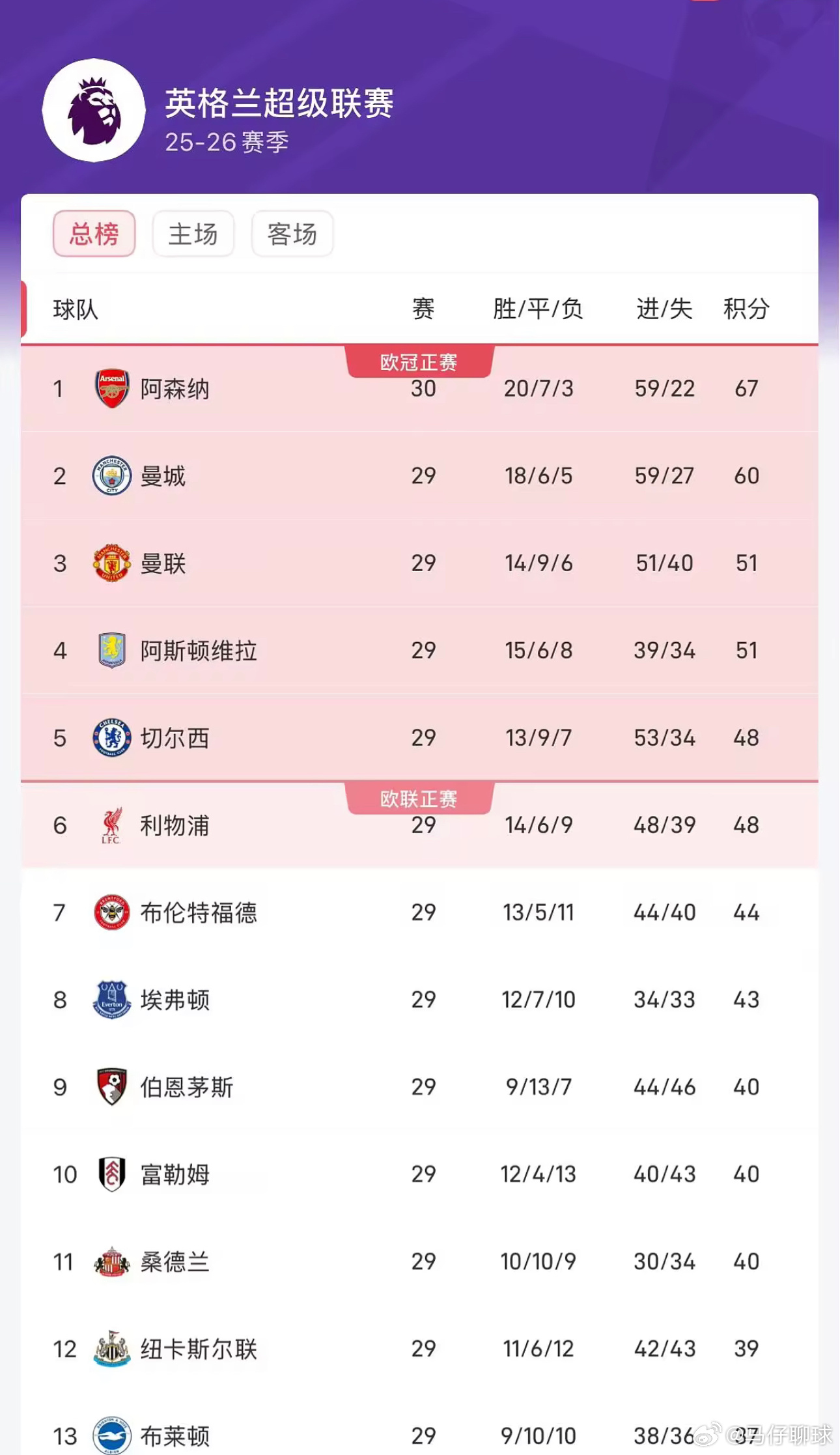 在最新的积分榜中,阿森纳多赛一场积67分,领先第二名的曼城7分,曼联积51分排在第三位,4-6名分别是维拉、切尔西和利物浦。