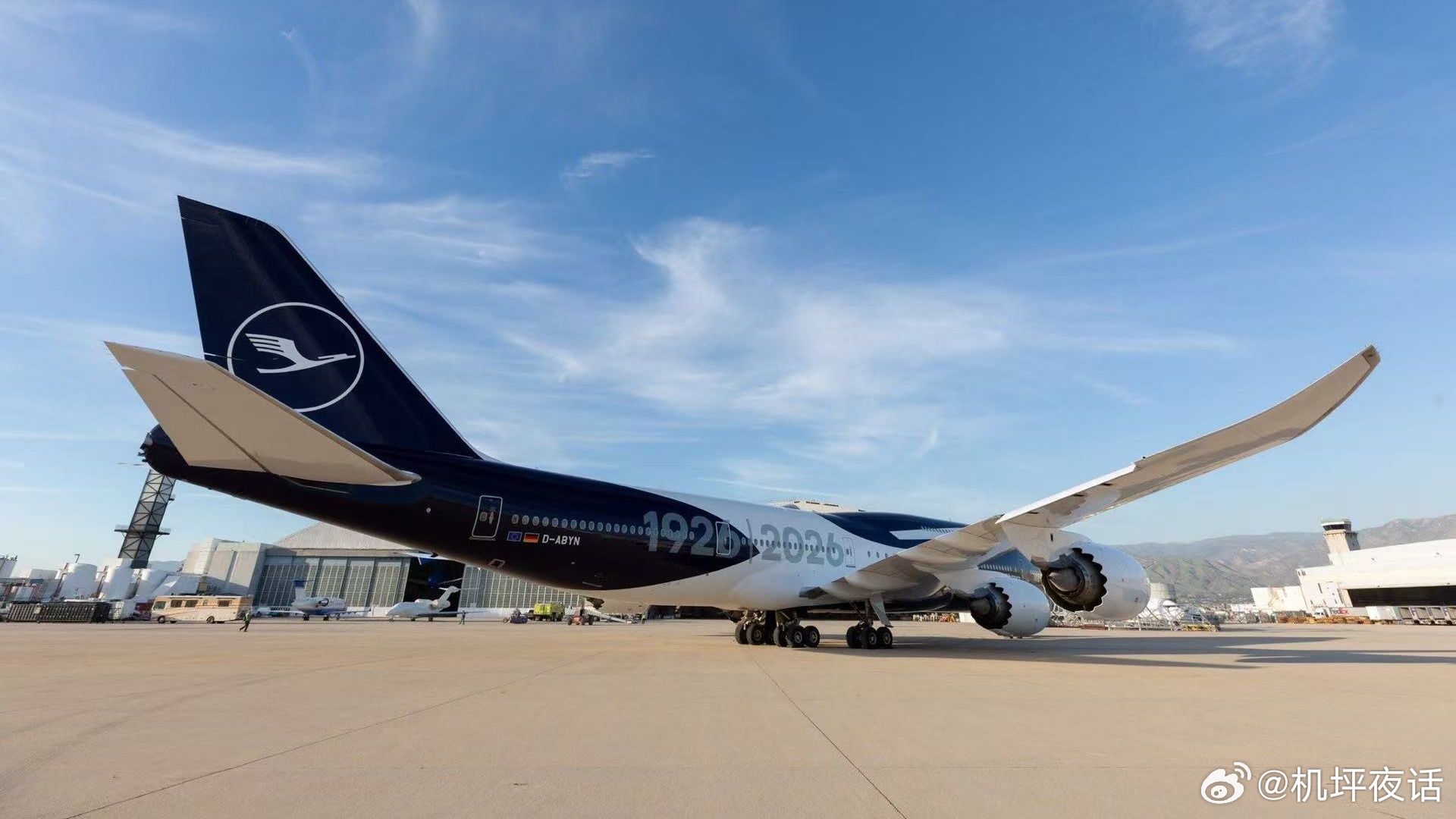 汉莎航空成立百年纪念的涂装元素包含:机身左侧喷涂汉莎航空经典的飞鹤图案与“100”字样,机身右侧喷涂“1926-2026”时间标识,机首则为延伸至机腹的蓝黑色设计。