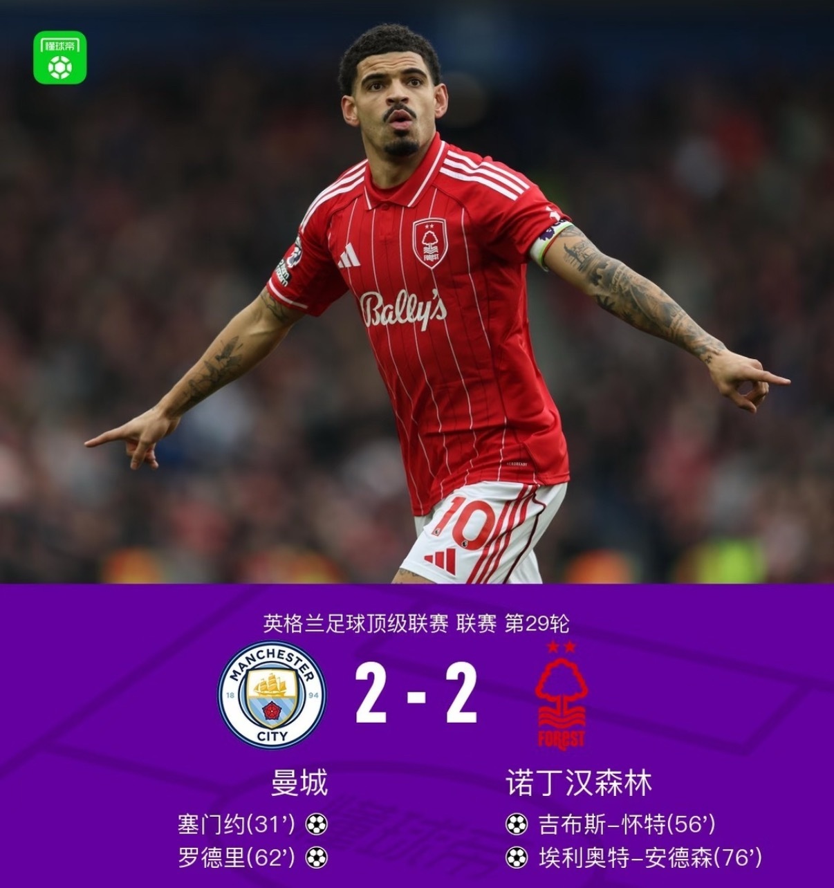 曼城2比2诺丁汉森林 英超第29轮,曼城主场两度领先被诺丁汉森林扳平,最终2-2战平,6连胜遭终结,争冠形势进一步被动。英超联赛