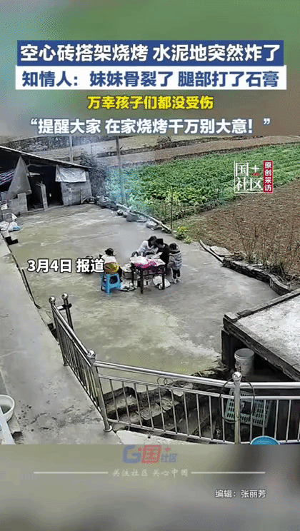 吓人!一家四口在水泥地上,用空心砖搭架烧烤,因为烟太大,夫妻俩蹲地上正想办法怎么弄,可万万没想到,地面突然就炸了。 两个女儿离得远,除了受点惊吓外,没啥大碍,丈夫问题也不大,只有妻子可能离的太近,直接被巨大的冲击力掀翻在地,导致腿部骨裂。 据夫妻俩讲,以前也这样烤过,没出过事,不知道这次是怎么回事。 看到这一幕,我也感到疑惑不解,从小到大没有见过这样的,水泥地怎么会因为在上面烤个东西就炸呢? 后来我专门查了一下,好像是水泥长时间受热膨胀导致的,要想避免这种情况发生,可以垫一个隔热的东西,也有些人说可以适当铺点泥土。 反正我是没有这样在外边烤过,一是嫌烟大,二是手艺也不行,三是挺麻烦的,我一般都是去店里边吃烧烤。 当然,如果非得在家烧烤,或者去野外烧烤,那么一定得注意安全,千万不能大意。 顺便问一句,大家遇到过这种情况吗? 来源:新晚报 空心砖搭架烧烤 水泥地突然爆炸