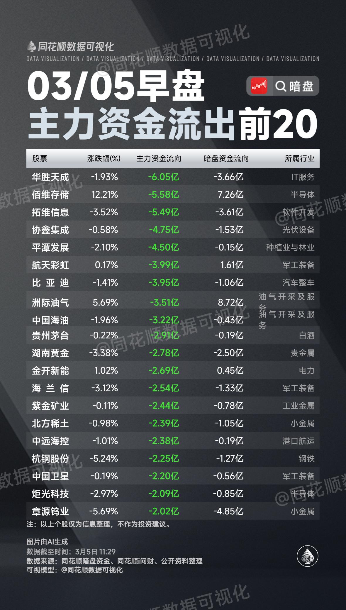 一、主力资金流入前20核心特征📈 从3月5日早盘主力资金流入榜来看,市场呈现出科技与能源装备双主线的格局: 1. 科技板块(光模块/CPO/半导体):新易盛、中际旭创、三安光电、聚飞光电、国盾量子等个股获资金重点布局,核心驱动是AI算力需求爆发及光模块技术迭代。 2. 能源装备(电网/核电/电力):上海电气、中国西电、特变电工、中超控股、华银电力等表现突出,受益于特高压建设、可控核聚变及新能源装机预期。 3. 资金强度:新易盛(29.22亿)、上海电气(21.24亿)、岩山科技(18.47亿)占据流入前三,显示出极高的资金认可度。 二、主力资金流出前20核心特征📉 资金流出主要集中在传统板块及部分科技股,呈现明显的“高低切换”特征: 1. 科技股分化:佰维存储、拓维信息、华胜天成等虽属科技赛道,但出现资金流出,或因短期涨幅过大导致获利了结。 2. 传统板块承压:油气(中国海油、洲际油气)、贵金属(湖南黄金、章源钨业)、白酒(贵州茅台)、汽车(比亚迪)等板块遭资金减持。 3. 流出强度:华胜天成(-6.05亿)、佰维存储(-5.58亿)、拓维信息(-5.49亿)位列流出前三。 三、综合判断与提示⚠️ 1. 主线清晰:光模块/CPO、特高压/电网设备仍是当前最强主线,资金与热点高度共振。 2. 分化加剧:科技板块内部出现明显分化,部分高位股遭资金兑现,需警惕板块回调风险。 3. 资金流向:资金从传统防御板块(白酒、油气、贵金属)向高景气的科技与能源装备板块迁移,市场风险偏好提升。 4. 风险提示:以上数据仅为市场公开信息整理,不构成任何投资建议!!!