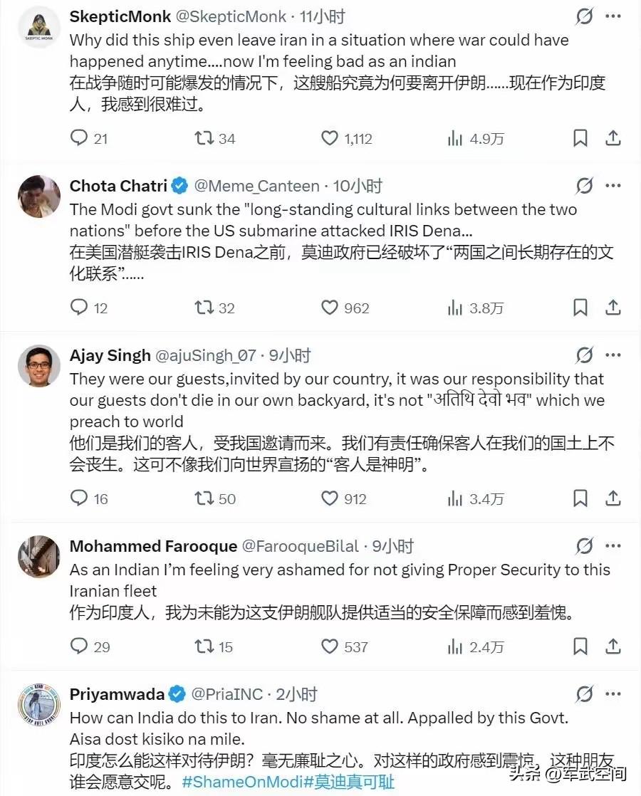印度:伊朗护卫舰在印度洋被击沉,是印度的巨大耻辱。 3月5日,据印度多家媒体报道,伊朗护卫舰“达纳”号,在斯里兰卡和印度之间的国际水域,被美国潜艇击沉,印度全国上下直呼这是印度巨大耻辱。 要知道这艘伊朗护卫舰,刚结束印度在孟加拉湾举办的国际阅舰式和军事演习,在返航途中被美国击沉是不可接受的。不少印度网友说到:“我们的莫迪总理出访以色列后,就发生的事件”。