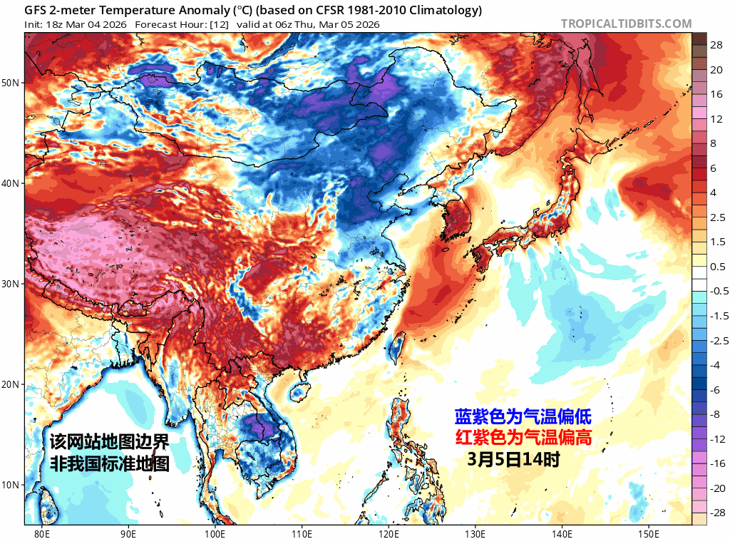 从常年来看,惊蛰正是一年中气温快速上升的时期,但也是气温波动起伏很大的时期。从今后10天的气温距平预报看,青藏高原会大幅度偏高。其他地区冷暖交杂(图8)。图9为3月5日-19日,每天14时的气温偏低偏高的预报,可见冷暖反差变化很大。先有冷空气东移南下,再有暖空气东移,之后再来冷空气。
