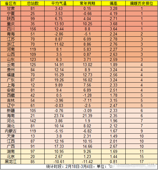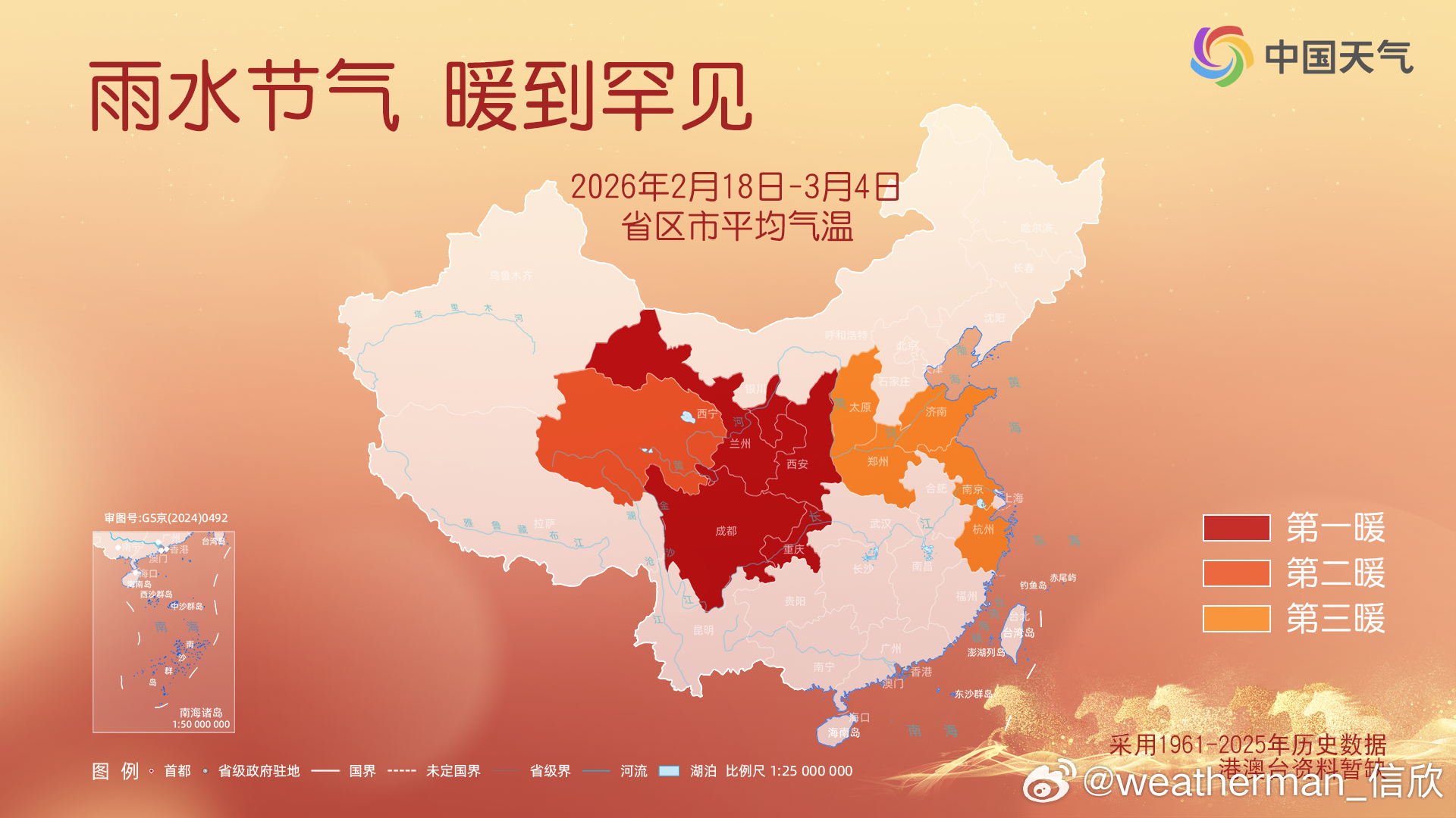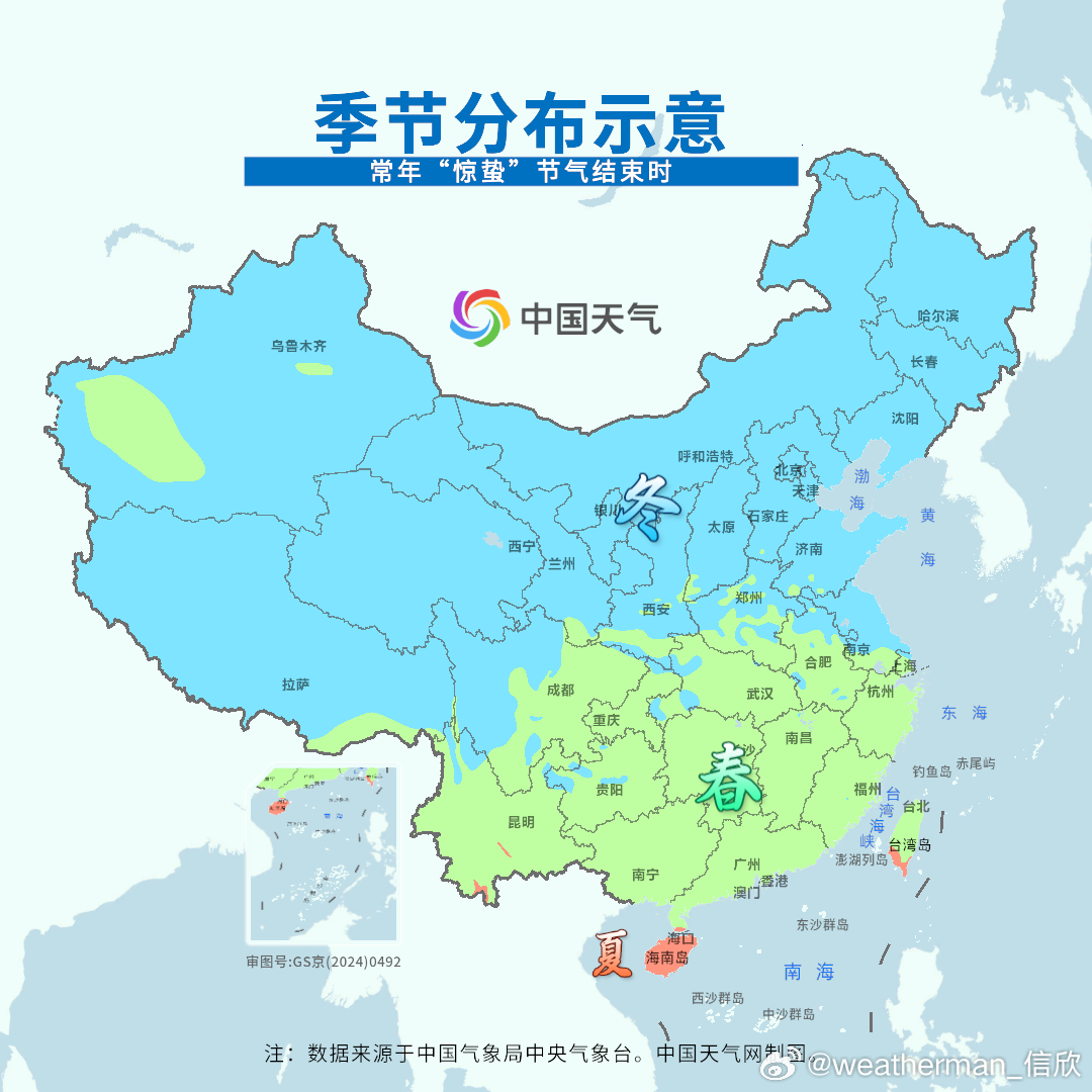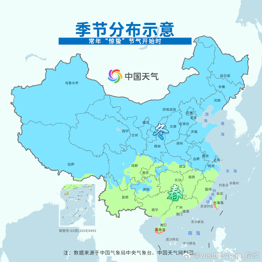 【今日惊蛰】今天进入惊蛰节气。回看雨水节气(2月18日-3月4日),按照面积加权,我国平均气温2.89℃,偏高2.27℃,为1961年以来第二暖的雨水节气,其中甘肃、宁夏、陕西、四川、重庆为同期最暖。也因为气温偏高,换季提前,长江以南大部均已经入春,夏天已经推进到了广东徐闻。