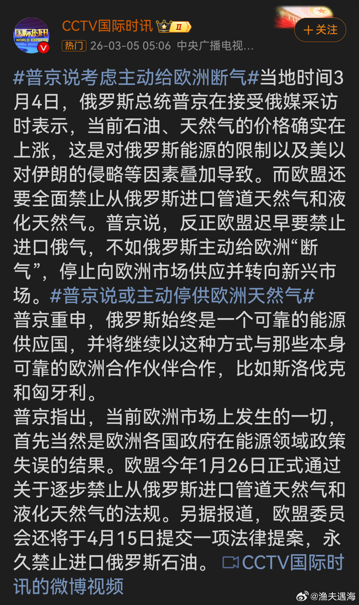普京说考虑主动给欧洲断气普京提出考虑主动断气这一表态强硬且有底气,是对欧盟能源禁令的有力回应。欧洲能源政策失误致价格上涨,自身先出招禁俄能源。俄罗斯有新兴市场可转,而部分可靠伙伴仍能维系合作,欧洲或自食能源危机苦果。