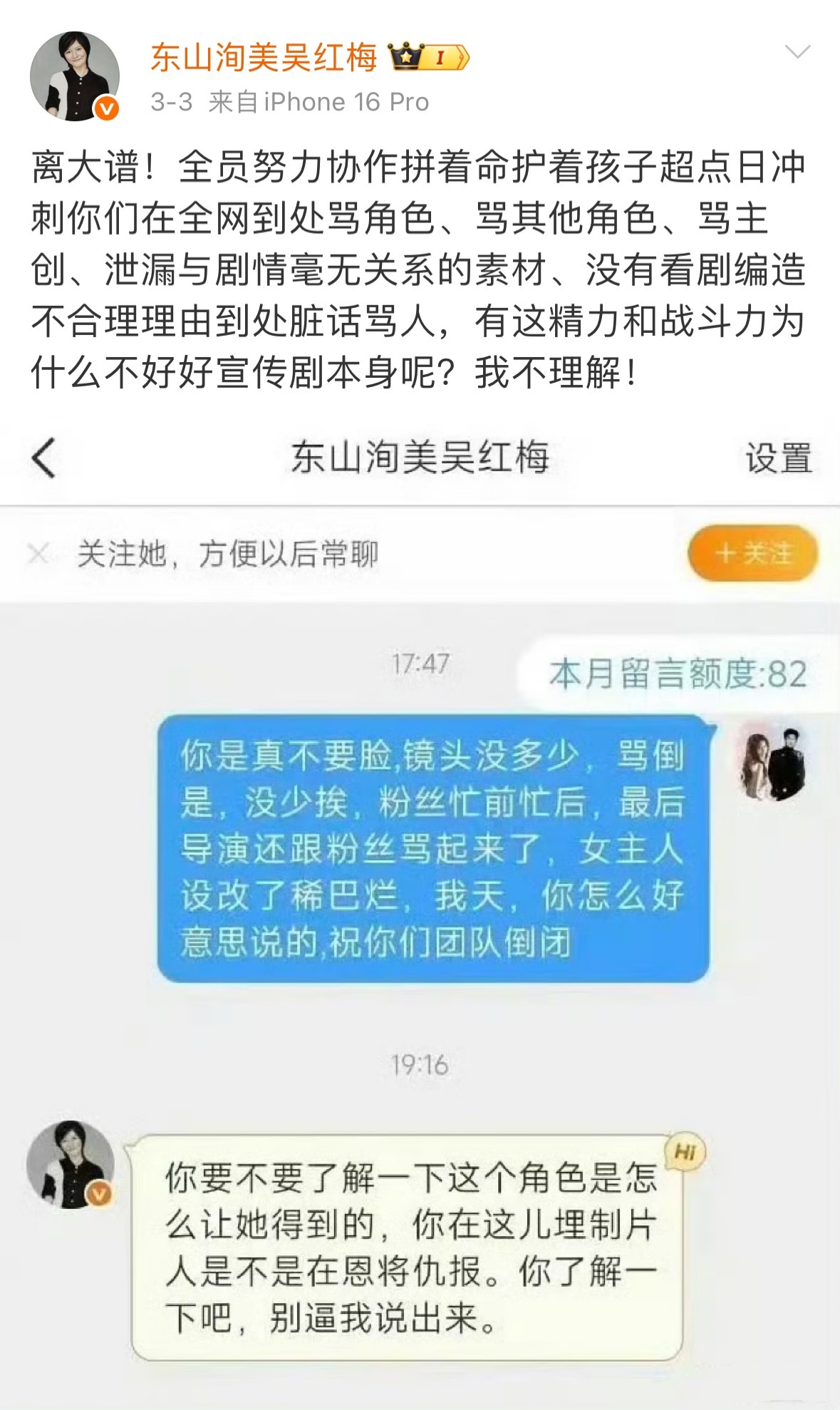 关晓彤粉丝控诉:岁月有情女主成长线无被剪成了大男主剧,女二加戏加到厌恶粉丝私信麻辣制片人,制片人内涵晓彤是如何得到角色的、可是你之前不是这么说的哦,各种夸她,现在不仅把帖子删了,还变如脸是做甚… 制片人回应关晓彤戏份少