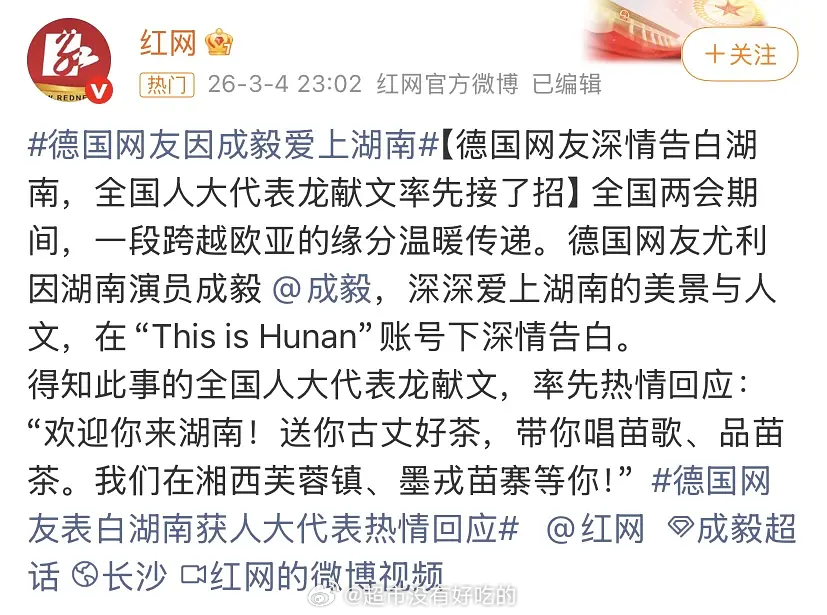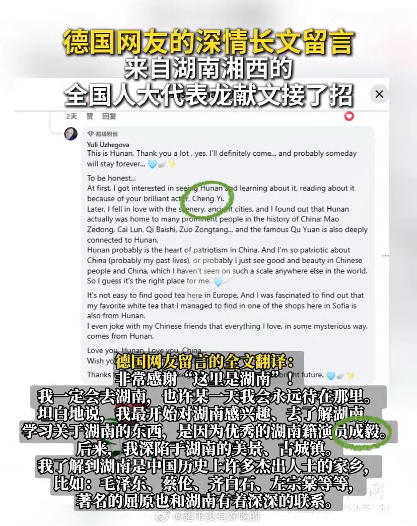 海外网友说自己因成毅爱上湖南的美景与人文深情告白留言被湖南湘西的全国人大代表热情回应了好演员的魅力就是这样吧,用作品带动文化输出,跨越国界的温暖❤️成毅 成毅