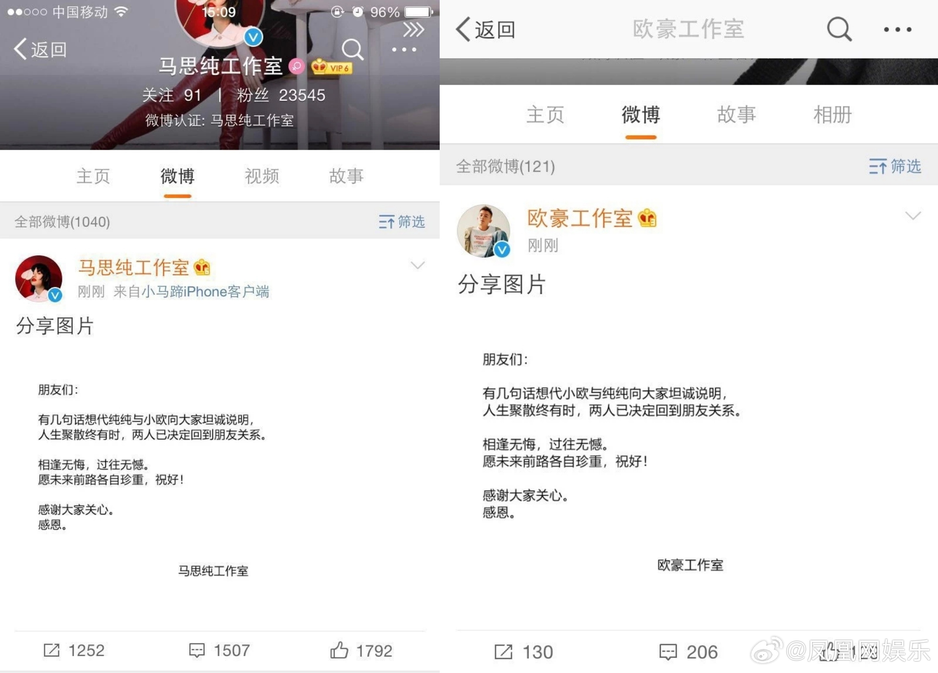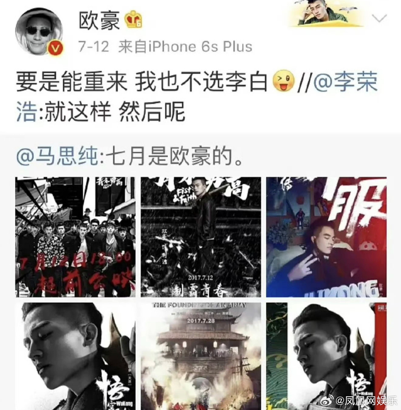 与欧豪恋情:2014年:两人合作电影《左耳》相识,感情逐渐升温。2015年:两人确立恋爱关系。2017年3月14日:马思纯生日当天官宣与欧豪恋情。2017年7月:马思纯为欧豪宣传电影,并表示“七月是欧豪的”。2017年–2018年:两人热恋,互动频繁,包括机场牵手、公开秀恩爱等。2018年8月:双方工作室宣布两人和平分手,称“未来各自安好”。分手后马思纯患抑郁症。2025年11月:两人分手后参加同一个盛典活动,但无实际互动。