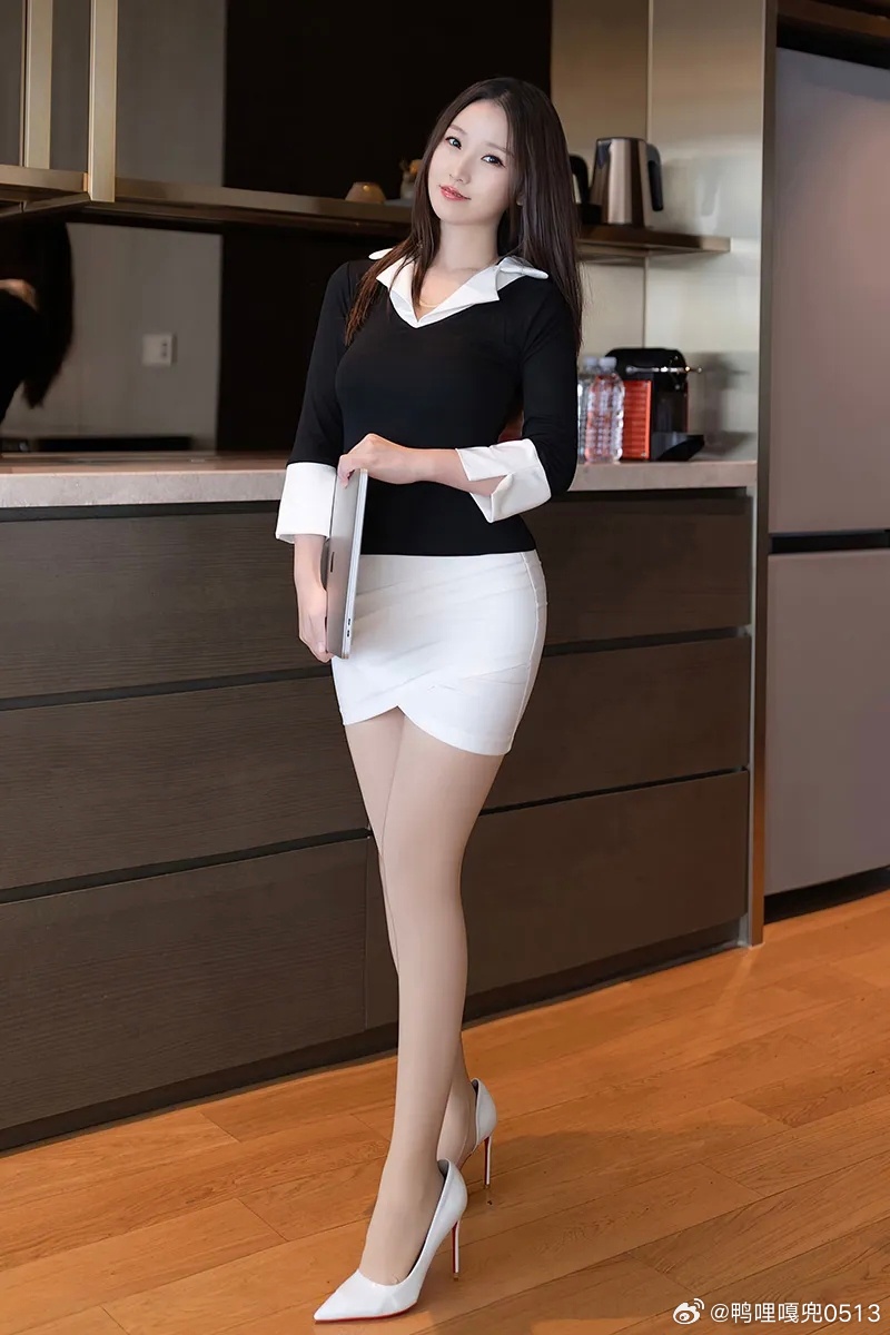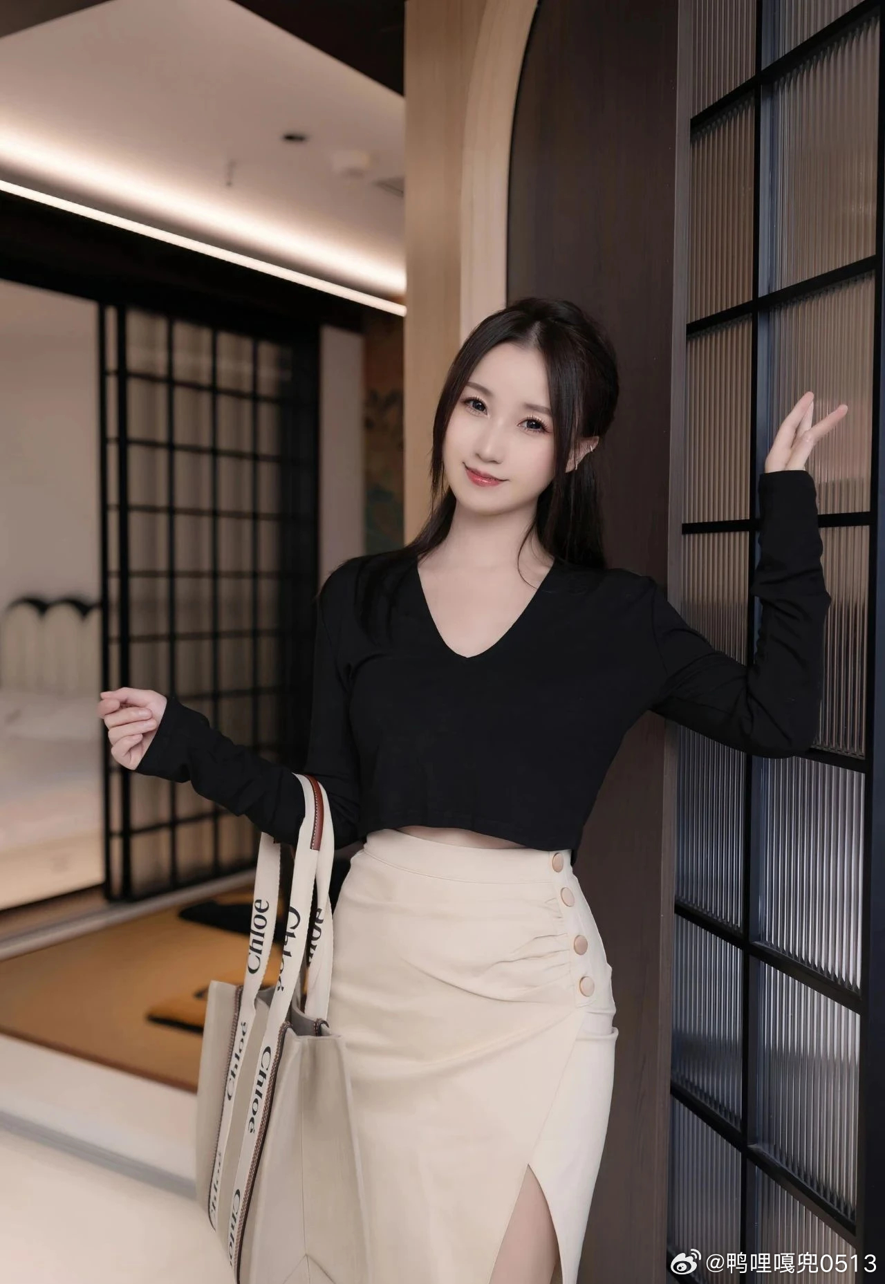 写真 深V黑色衬衫搭配白色短裙真的好精致