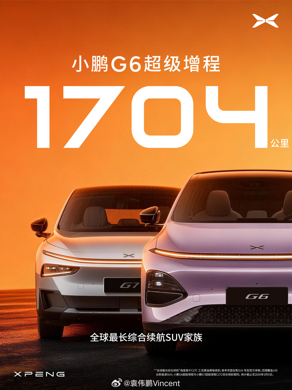 小鹏G6超级增程上市定档3月6日小鹏G6超级增程六项全能一步到位 「六项全能 一步到位」的小鹏G6超级增程,正式定档3月6日15:00发布!全球综合续航最长SUV,CLTC综合续航1704km,纯电430km,日常远行全兼。增程版要的就是续航啊!