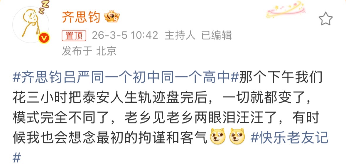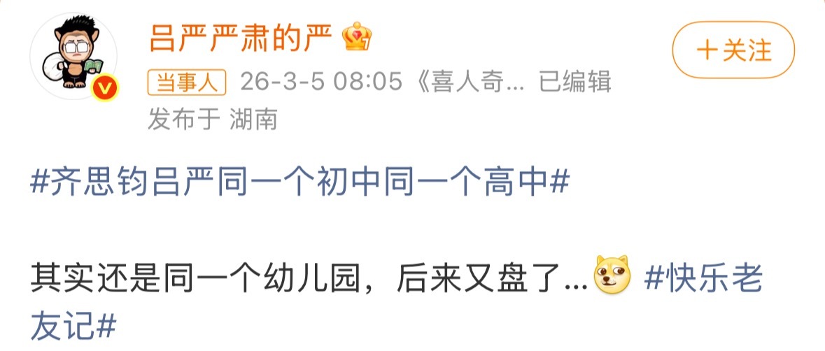 齐思钧回应和吕严同一个初高中齐思钧吕严都出来回应同一个初高中,才知道俩人甚至连幼儿园都上的同一个,这是什么神仙缘分快乐老友记快乐老友有风季