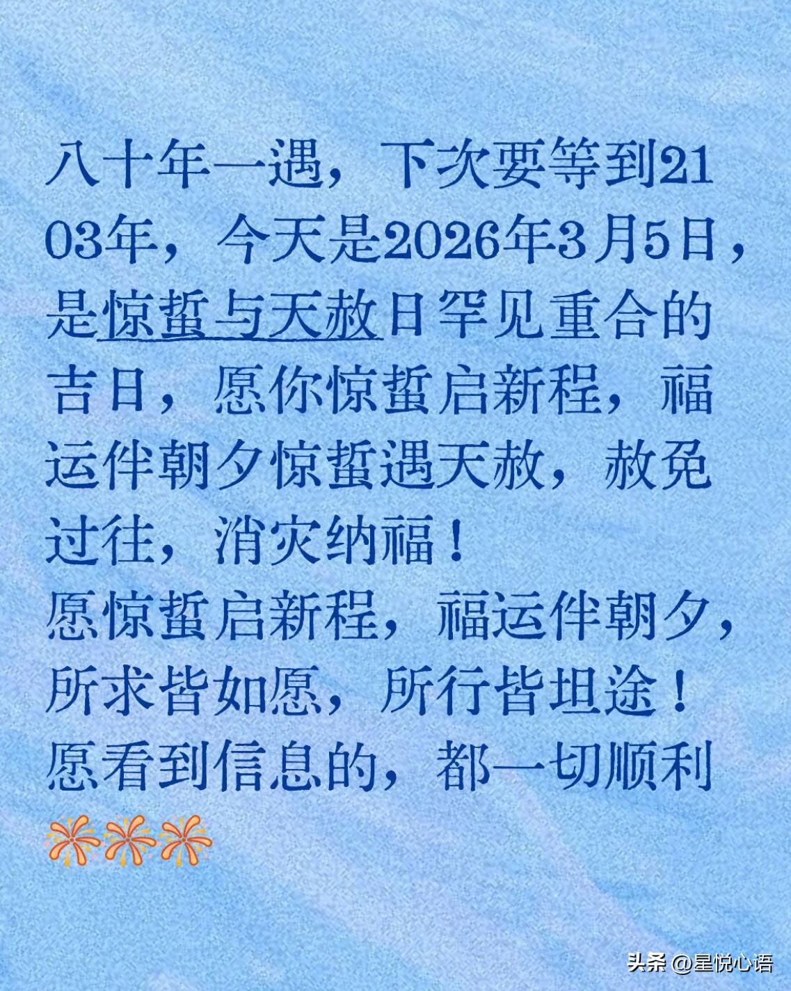 2026年3月5日是大幸运日! 惊蛰撞上天赦日 八十年才一遇的吉日 下次再相逢要等到2103年了。 惊蛰春雷响,万物焕新生 所有美好皆萌芽 天赦日福运至,消灾解厄 过往烦恼皆赦免。 双吉叠加,福运加倍! 愿日子顺顺利利,所求皆如愿 所行皆坦途,岁岁常欢愉,年年皆胜意!