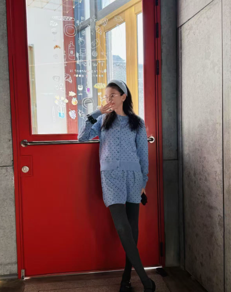 宋祖儿私服穿搭真时髦 蓝色波点开衫+灰色打底袜+短裙,高级又洋气