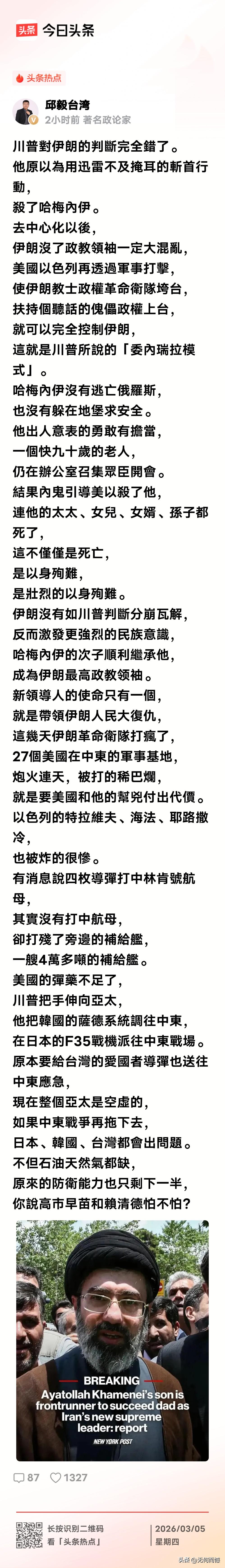 老特现在的处境非常的尴尬,他的研判出现了重大的失误,过高估计了自己的实力,过低估计了伊朗的反抗精神,他以为除掉一个哈梅内伊,通过速战速决的方式,就能够获取最大的利益,实际上他是想错了,而且也做错了,现在出现的全面反击的效果,恐怕已经完全超出了他的预想,看看这个烂摊子最后该如何收拾,也许这次贸然对伊朗袭击,很可能是一个重大的转折!